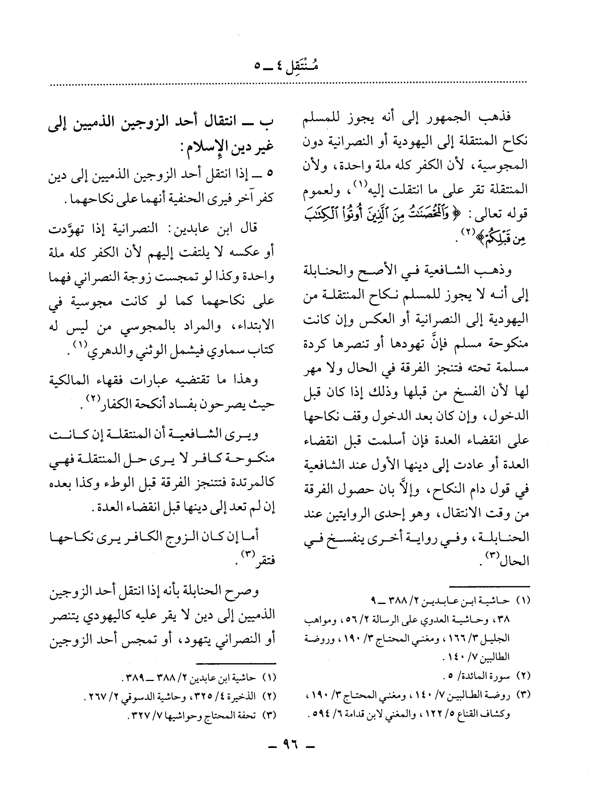 فَذَهَبَ الْجُمْهُورُ إِلَى أَنَّهُ يَجُوزُ لِلْمُسْلِمِ نِكَاحُ الْمُنْتَقِلَةِ إِلَى الْيَهُودِيَّةِ أَوِ النَّصْرَانِيَّةِ دُونَ الْمَجُوسِيَّةِ؛ لأَِنَّ الْكُفْرَ كُلَّهُ مِلَّةٌ وَاحِدَةٌ؛ وَلأَِنَّ الْمُنْتَقِلَةَ تُقَرُّ عَلَى مَا انْتَقَلَتْ إِلَيْهِ (1) ؛ وَلِعُمُومِ قَوْله تَعَالَى: {وَالْمُحْصَنَاتُ مِنَ الَّذِينَ أُوتُوا الْكِتَابَ مِنْ قَبْلِكُمْ} (2) .