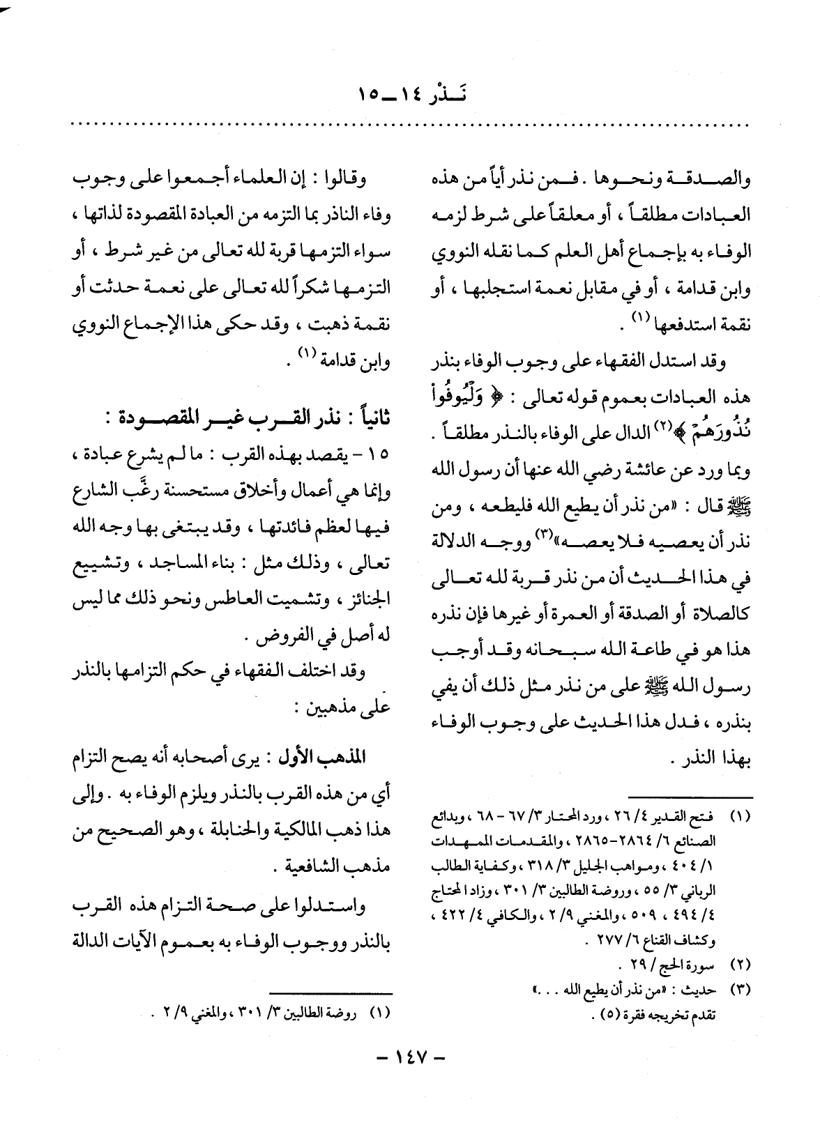 وَالصَّدَقَةِ وَنَحْوِهَا. فَمَنْ نَذَرَ أَيًّا مِنْ هَذِهِ الْعِبَادَاتِ مُطْلَقًا، أَوْ مُعَلَّقًا عَلَى شَرْطٍ لَزِمَهُ الْوَفَاءُ بِهِ بِإِجْمَاعِ أَهْل الْعِلْمِ كَمَا نَقَلَهُ النَّوَوِيُّ وَابْنُ قُدَامَةَ، أَوْ فِي مُقَابِل نِعْمَةٍ اسْتَجْلَبَهَا، أَوْ نِقْمَةٍ اسْتَدْفَعَهَا (1) .