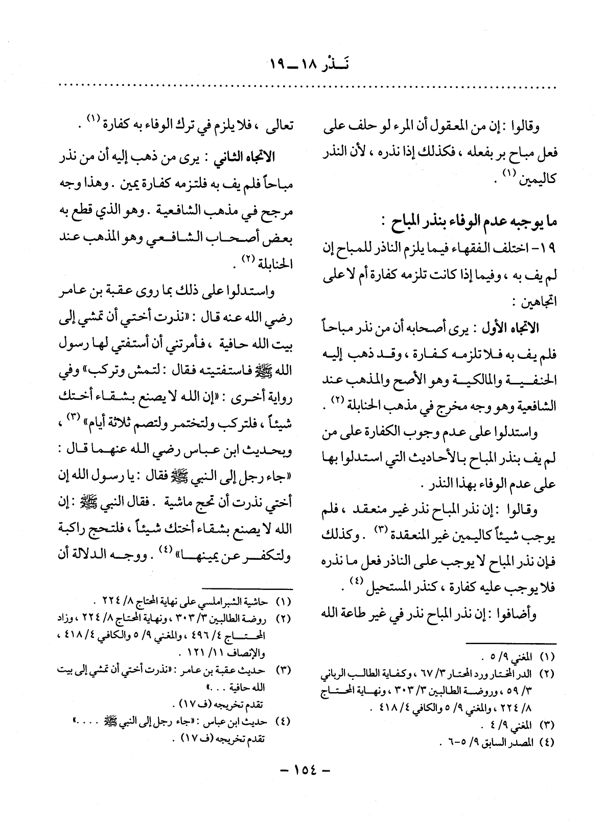 19 - اخْتَلَفَ الْفُقَهَاءُ فِيمَا يَلْزَمُ النَّاذِرَ لِلْمُبَاحِ إِنْ لَمْ يَفِ بِهِ، وَفِيمَا إِذَا كَانَتْ تَلْزَمُهُ كَفَّارَةٌ أَمْ لاَ عَلَى اتِّجَاهَيْنِ: