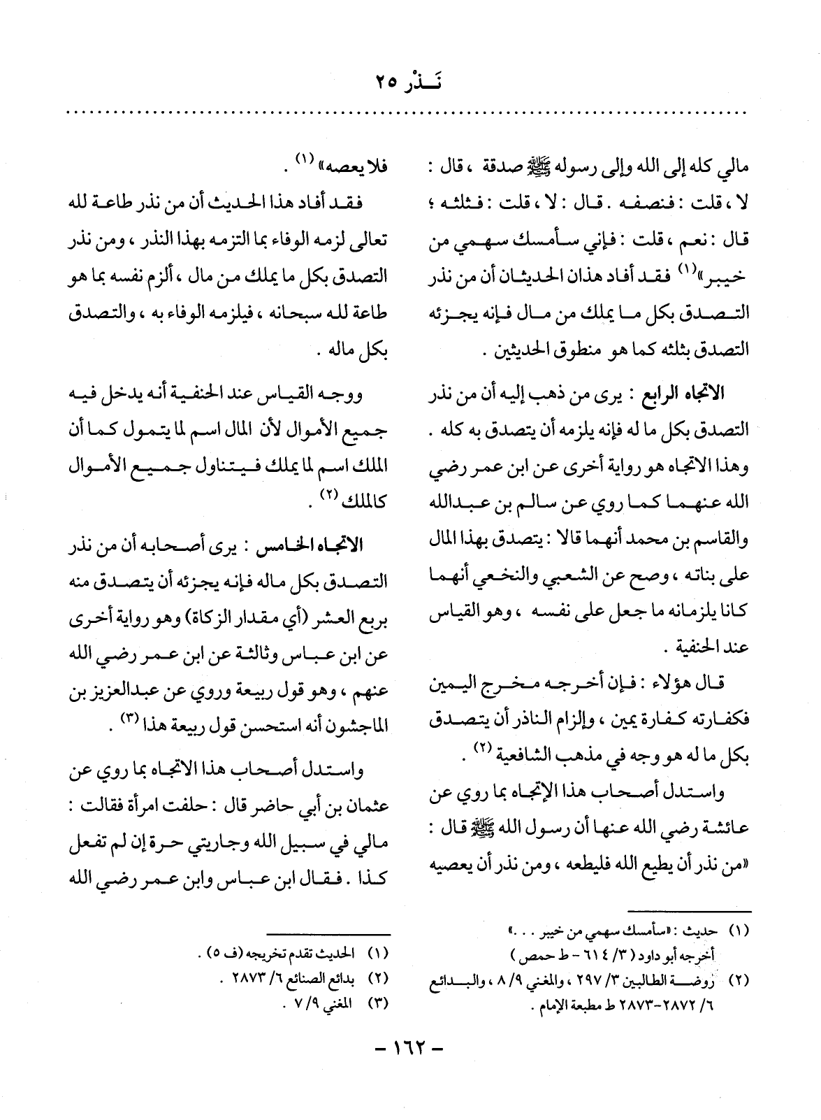 مَالِي كُلِّهِ إِلَى اللَّهِ وَإِلَى رَسُولِهِ صَلَّى اللَّهُ عَلَيْهِ وَسَلَّمَ صَدَقَةً، قَال: لاَ، قُلْتُ: فَنِصْفُهُ. قَال: لاَ، قُلْتُ: فَثُلُثُهُ؛ قَال: نَعَمْ، قَلْتُ: فَإِنِّي سَأُمْسِكُ سَهْمِي مِنْ خَيْبَرَ (1) فَقَدْ أَفَادَ هَذَانِ الْحَدِيثَانِ أَنَّ مَنْ نَذَرَ التَّصَدُّقَ بِكُل مَا يَمْلِكُ مِنْ مَالٍ فَإِنَّهُ يُجْزِئُهُ التَّصَدُّقُ بِثُلُثِهِ كَمَا هُوَ مَنْطُوقُ الْحَدِيثَيْنِ.