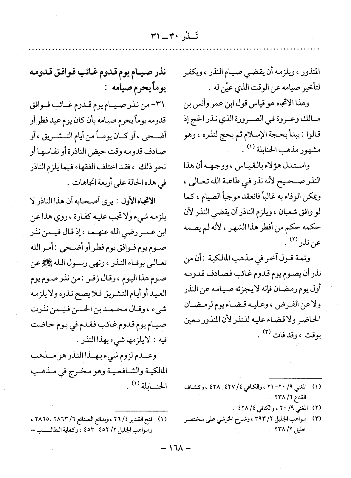 31 - مَنْ نَذَرَ صِيَامَ يَوْمِ قُدُومِ غَائِبٍ فَوَافَقَ قُدُومُهُ يَوْمًا يَحْرُمُ صِيَامُهُ بِأَنْ كَانَ يَوْمَ عِيدِ فِطْرٍ أَوْ أَضْحَى، أَوْ كَانَ يَوْمًا مِنْ أَيَّامِ التَّشْرِيقِ، أَوْ صَادَفَ قُدُومُهُ وَقْتَ حَيْضِ النَّاذِرَةِ أَوْ نِفَاسِهَا أَوْ نَحْوَ ذَلِكَ، فَقَدِ اخْتَلَفَ الْفُقَهَاءُ فِيمَا يَلْزَمُ النَّاذِرَ فِي هَذِهِ الْحَالَةِ عَلَى أَرْبَعَةِ اتِّجَاهَاتٍ.