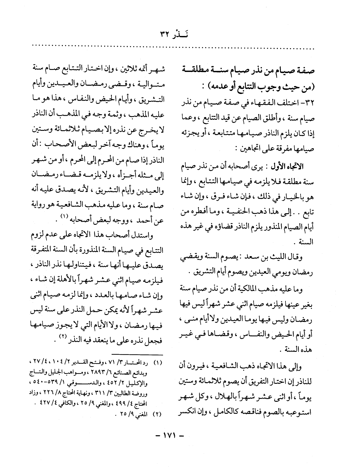 32 - اخْتَلَفَ الْفُقَهَاءُ فِي صِفَةِ صِيَامِ مَنْ نَذَرَ صِيَامَ سَنَةٍ، وَأَطْلَقَ الصِّيَامَ عَنْ قَيْدِ التَّتَابُعِ، وَعَمَّا إِذَا كَانَ يَلْزَمُ النَّاذِرَ صِيَامُهَا مُتَتَابِعَةً، أَوْ يُجْزِئُهُ صِيَامُهَا مُفَرَّقَةً عَلَى اتِّجَاهَيْنِ: