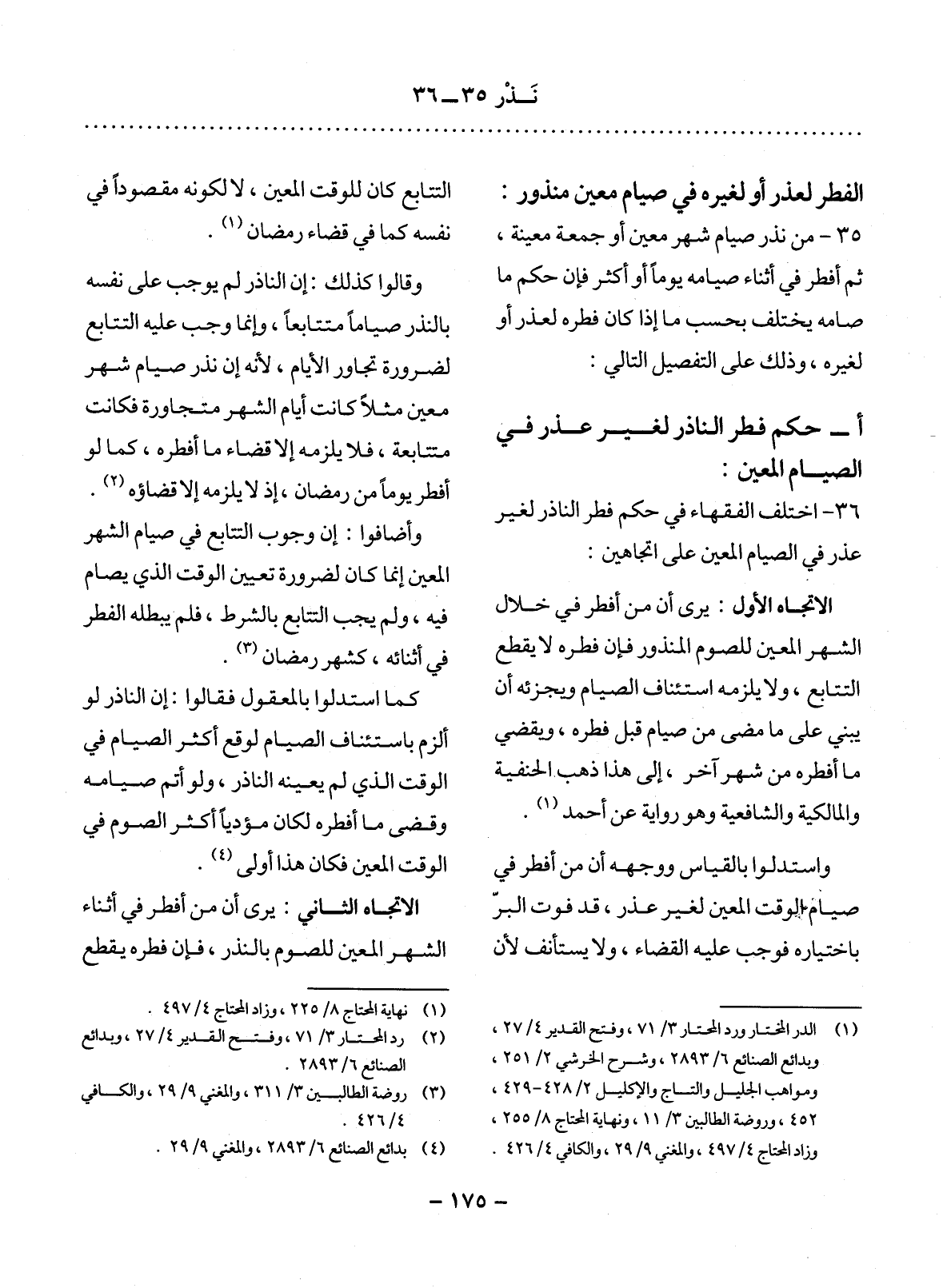 36 - اخْتَلَفَ الْفُقَهَاءُ فِي حُكْمِ فِطْرِ النَّاذِرِ لِغَيْرِ عُذْرٍ فِي الصِّيَامِ الْمُعَيَّنِ عَلَى اتِّجَاهَيْنِ: