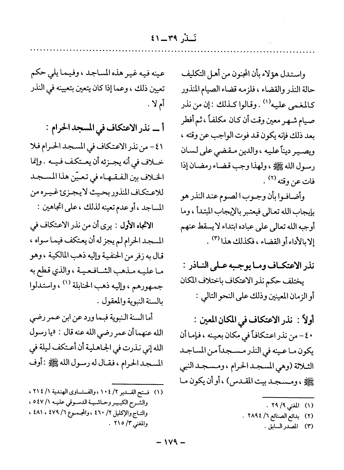 41 - مَنْ نَذَرَ الاِعْتِكَافَ فِي الْمَسْجِدِ الْحَرَامِ فَلاَ خِلاَفَ فِي أَنَّهُ يُجْزِئُهُ أَنْ يَعْتَكِفَ فِيهِ. وَإِنَّمَا الْخِلاَفُ بَيْنَ الْفُقَهَاءِ فِي تَعَيُّنِ هَذَا الْمَسْجِدِ لِلاِعْتِكَافِ الْمَنْذُورِ بِحَيْثُ لاَ يُجزِئُ غَيْرُهُ مِنَ الْمَسَاجِدِ، أَوْ عَدَمُ تَعَيُّنِهِ لِذَلِكَ، عَلَى اتِّجَاهَيْنِ: الاِتِّجَاهُ الأَْوَّل: يَرَى أَنَّ مَنْ نَذَرَ الاِعْتِكَافَ فِي الْمَسْجِدِ الْحَرَامِ لَمْ يَجُزْ لَهُ أَنْ يَعْتَكِفَ فِيمَا سِوَاهُ، قَال بِهِ زُفَرُ مِنَ الْحَنَفِيَّةِ وَإِلَيْهِ ذَهَبَ الْمَالِكِيَّةُ، وَهُوَ مَا عَلَيْهِ مَذْهَبُ الشَّافِعِيَّةِ، وَالَّذِي قَطَعَ بِهِ جُمْهُورُهُمْ، وَإِلَيْهِ ذَهَبَ الْحَنَابِلَةُ (1) ، وَاسْتَدَلُّوا بِالسُّنَّةِ النَّبَوِيَّةِ وَالْمَعْقُول.