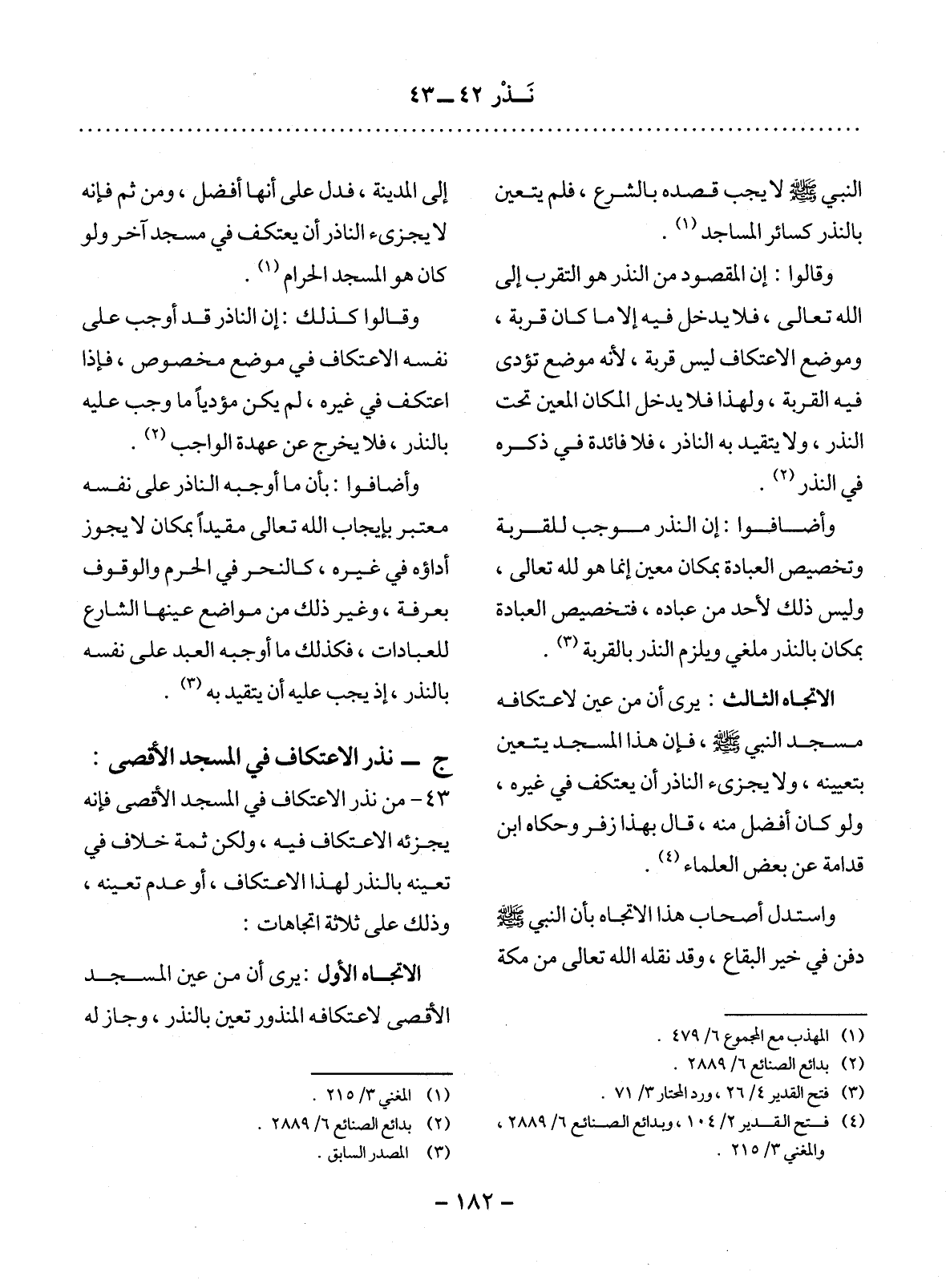 43 - مَنْ نَذَرَ الاِعْتِكَافَ فِي الْمَسْجِدِ الأَْقْصَى فَإِنَّهُ يُجْزِئُهُ الاِعْتِكَافُ فِيهِ، وَلَكِنْ ثَمَّةَ خِلاَفٌ فِي تَعَيُّنِهِ بِالنَّذْرِ لِهَذَا الاِعْتِكَافِ، أَوْ عَدَمِ تَعَيُّنِهِ، وَذَلِكَ عَلَى ثَلاَثَةِ اتِّجَاهَاتٍ: