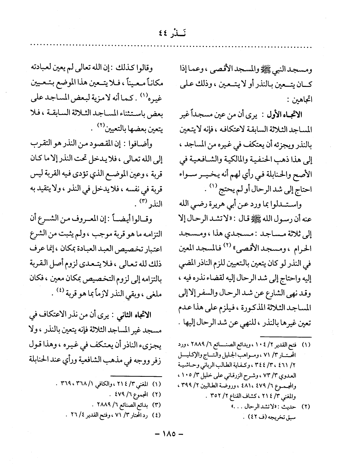 وَمَسْجِدِ النَّبِيِّ صَلَّى اللَّهُ عَلَيْهِ وَسَلَّمَ وَالْمَسْجِدِ الأَْقْصَى، وَعَمَّا إِذَا كَانَ يَتَعَيَّنُ بِالنَّذْرِ أَوْ لاَ يَتَعَيَّنُ، وَذَلِكَ عَلَى اتِّجَاهَيْنِ: