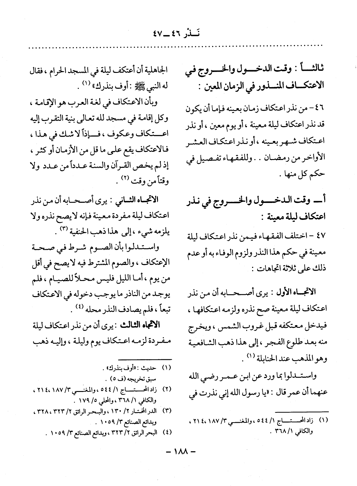 46 - مَنْ نَذَرَ اعْتِكَافَ زَمَانٍ بِعَيْنِهِ فَإِمَّا أَنْ يَكُونَ قَدْ نَذَرَ اعْتِكَافَ لَيْلَةٍ مُعَيَّنَةٍ، أَوْ يَوْمٍ مُعَيَّنٍ، أَوْ نَذَرَ اعْتِكَافَ شَهْرٍ بِعَيْنِهِ، أَوْ نَذَرَ اعْتِكَافَ الْعَشْرِ الأَْوَاخِرِ مِنْ رَمَضَانَ. . وَلِلْفُقَهَاءِ تَفْصِيلٌ فِي حُكْمِ كُلٍّ مِنْهَا.