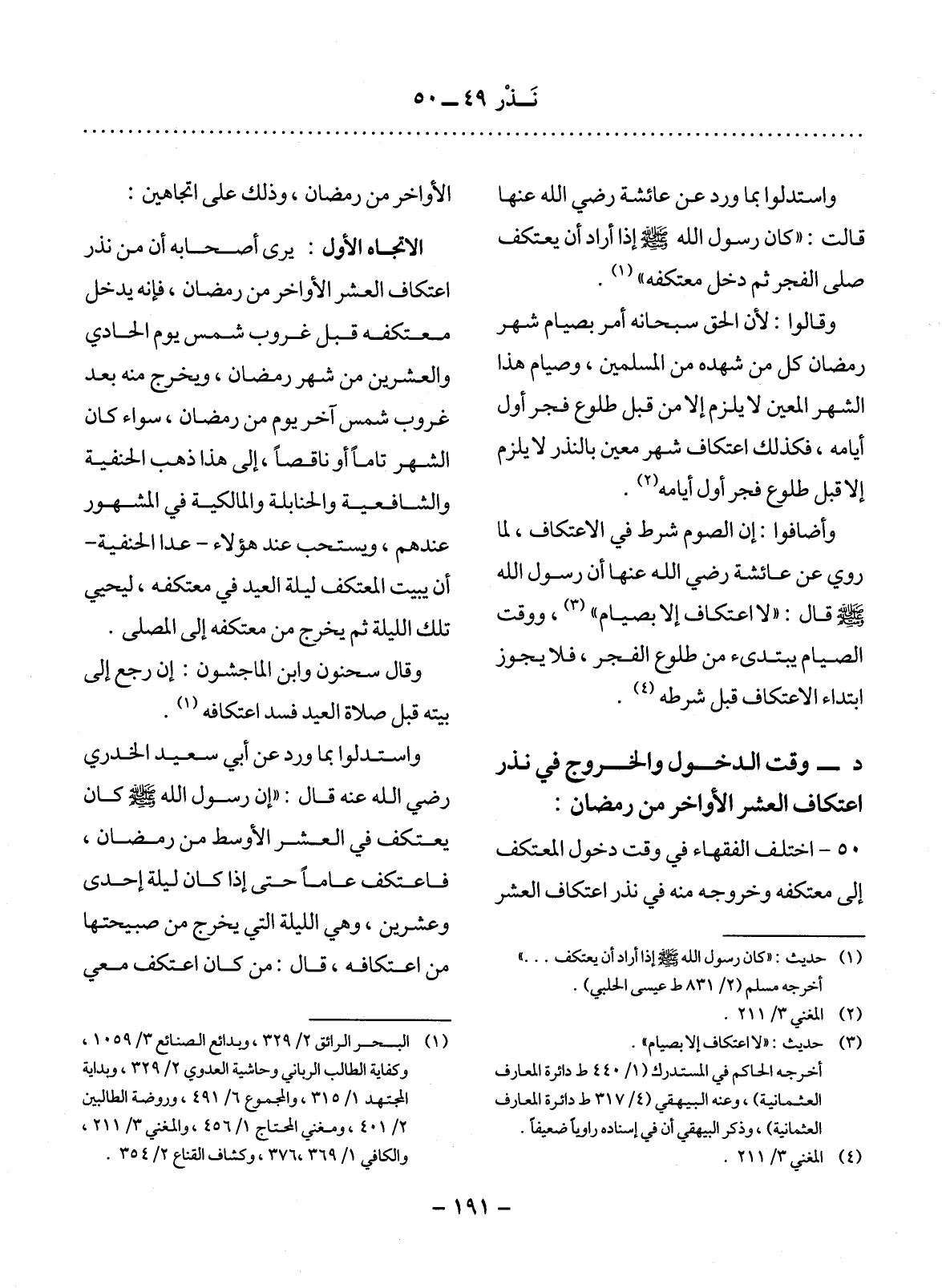 50 - اخْتَلَفَ الْفُقَهَاءُ فِي وَقْتِ دُخُول الْمُعْتَكِفِ إِلَى مُعْتَكَفِهِ وَخُرُوجِهِ مِنْهُ فِي نَذْرِ اعْتِكَافِ الْعَشْرِ