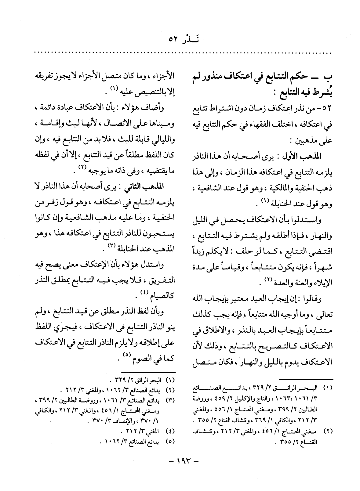 52 - مَنْ نَذَرَ اعْتِكَافَ زَمَانٍ دُونَ اشْتِرَاطِ تَتَابُعٍ فِي اعْتِكَافِهِ، اخْتَلَفَ الْفُقَهَاءُ فِي حُكْمِ التَّتَابُعِ فِيهِ عَلَى مَذْهَبَيْنِ: