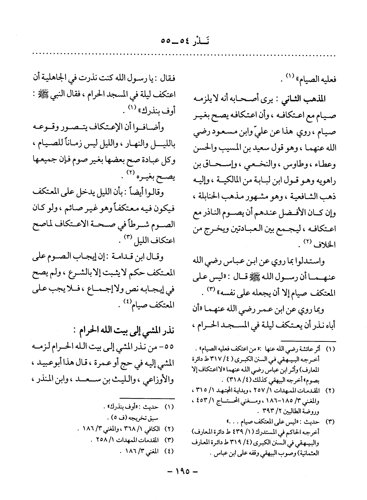 55 - مَنْ نَذَرَ الْمَشْيَ إِلَى بَيْتِ اللَّهِ الْحَرَامِ لَزِمَهُ الْمَشْيُ إِلَيْهِ فِي حَجٍّ أَوْ عُمْرَةٍ، قَال هَذَا أَبُو عُبَيْدٍ، وَالأَْوْزَاعِيُّ، وَاللَّيْثُ بْنُ سَعْدٍ، وَابْنُ الْمُنْذِرِ.