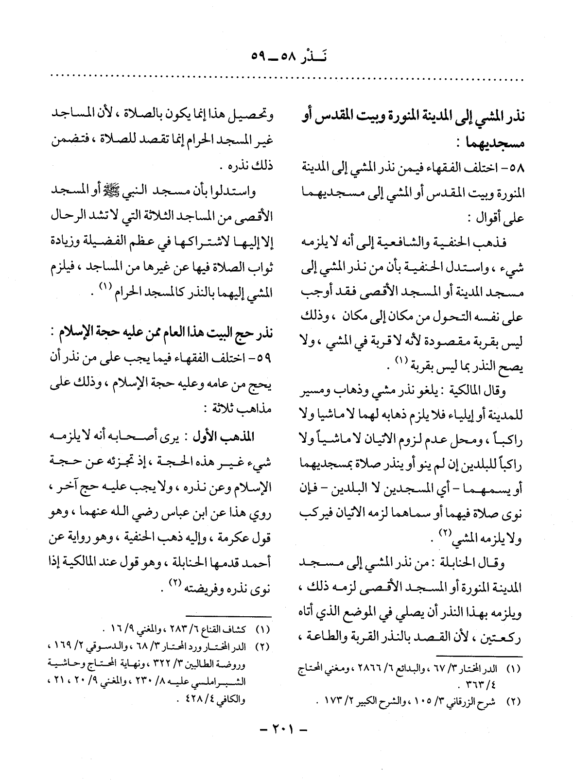 58 - اخْتَلَفَ الْفُقَهَاءُ فِيمَنْ نَذَرَ الْمَشْيَ إِلَى الْمَدِينَةِ الْمُنَوَّرَةِ وَبَيْتِ الْمَقْدِسِ أَوِ الْمَشْيِ إِلَى مَسْجِدَيْهِمَا عَلَى أَقْوَالٍ: