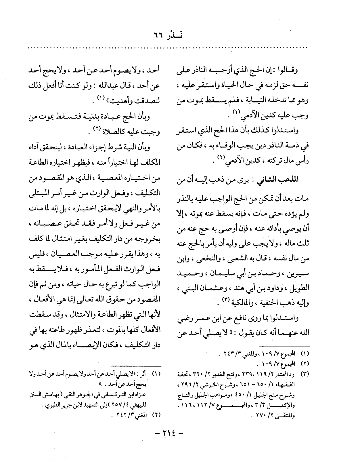 الْمَذْهَبُ الثَّانِي: يَرَى مَنْ ذَهَبَ إِلَيْهِ أَنَّ مَنْ مَاتَ بَعْدَ أَنْ تَمَكَّنَ مِنَ الْحَجِّ الْوَاجِبِ عَلَيْهِ بِالنَّذْرِ وَلَمْ يُؤَدِّهِ حَتَّى مَاتَ، فَإِنَّهُ يَسْقُطُ عَنْهُ بِمَوْتِهِ، إِلاَّ أَنْ يُوصِيَ بِأَدَائِهِ عَنْهُ، فَإِنْ أَوْصَى بِهِ حُجَّ عَنْهُ مِنْ ثُلُثِ مَالِهِ، وَلاَ يَجِبُ عَلَى وَلِيِّهِ أَنْ يَأْمُرَ بِالْحَجِّ عَنْهُ مِنْ مَال نَفْسِهِ، قَال بِهِ الشَّعْبِيُّ، وَالنَّخَعِيُّ، وَابْنُ سِيرِينَ، وَحَمَّادُ بْنُ أَبِي سُلَيْمَانَ، وَحُمَيْدٌ الطَّوِيل، وَدَاوُدُ بْنُ أَبِي هِنْدٍ، وَعُثْمَانُ الْبَتِّيُّ، وَإِلَيْهِ ذَهَبَ الْحَنَفِيَّةُ، وَالْمَالِكِيَّةُ (3) وَاسْتَدَلُّوا بِمَا رَوَى نَافِعٌ عَنِ ابْنِ عُمَرَ - رَضِيَ اللَّهُ عَنْهُمَا - أَنَّهُ كَانَ يَقُول: " لاَ يُصَلِّي أَحَدٌ عَنْ
