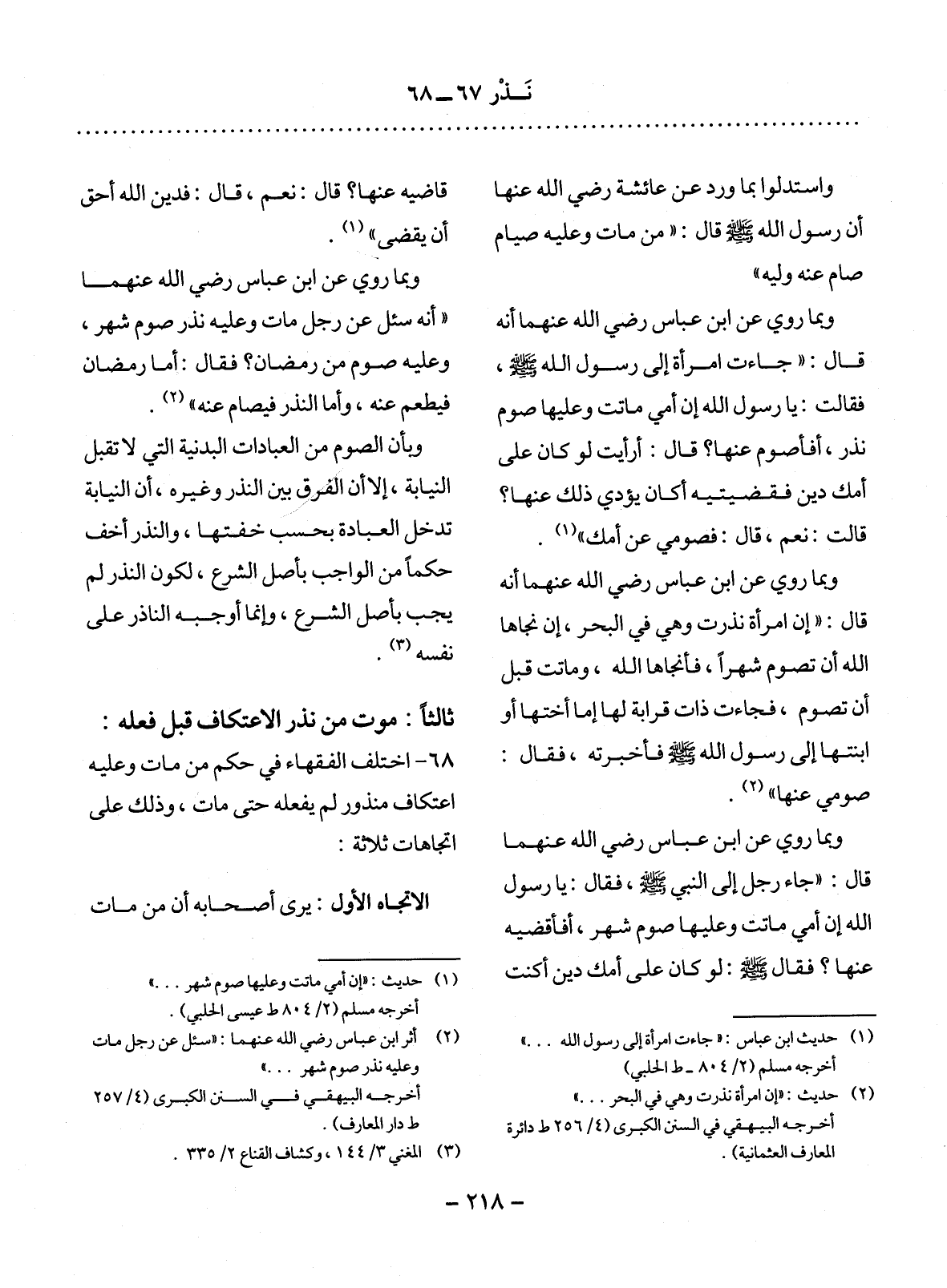 (2) أَثَرُ ابْنِ عَبَّاسٍ - رَضِيَ اللَّهُ عَنْهُمَا: " سُئِل عَنْ رَجُلٍ مَاتَ وَعَلَيْهِ نَذْرٌ صَوْمُ شَهْرٍ. . . " أَخْرَجَهُ الْبَيْهَقِيُّ فِي السُّنَنِ الْكُبْرَى (4 / 257 ط دَارِ الْمَعَارِفِ) .