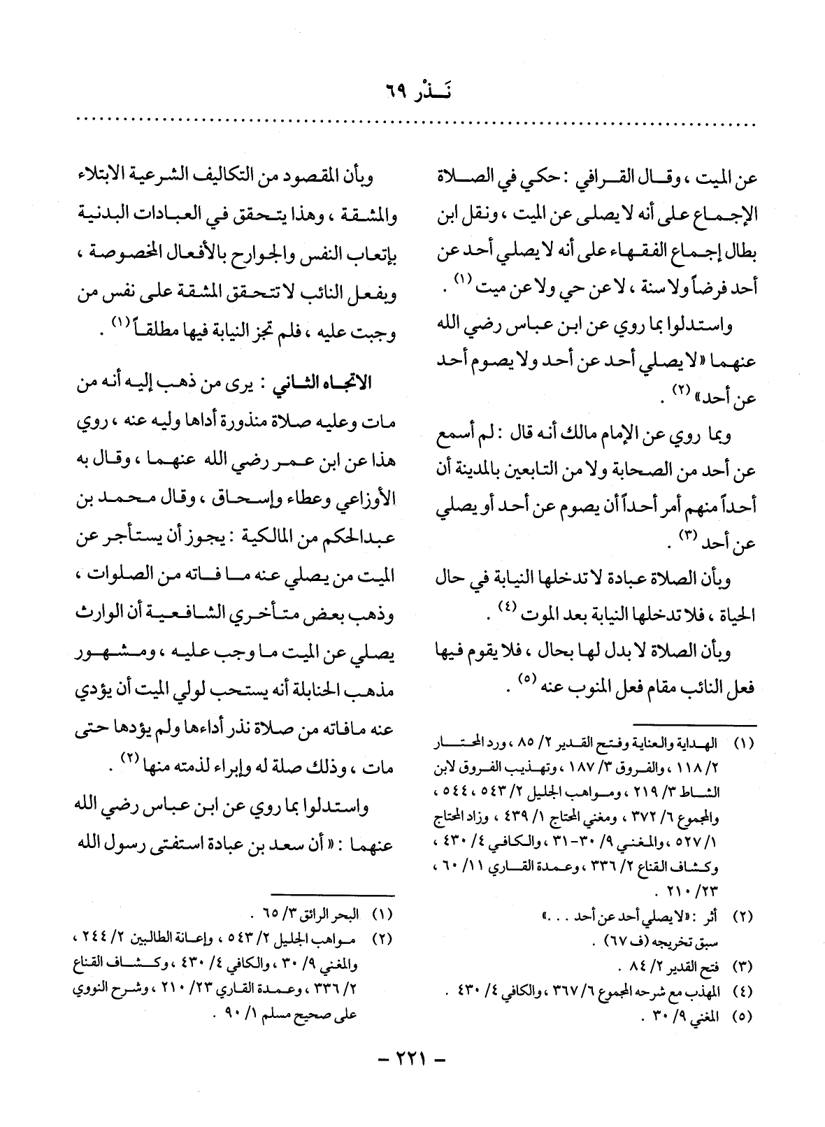 الاِتِّجَاهُ الثَّانِي: يَرَى مَنْ ذَهَبَ إِلَيْهِ أَنَّهُ مَنْ مَاتَ وَعَلَيْهِ صَلاَةٌ مَنْذُورَةٌ أَدَّاهَا وَلِيُّهُ عَنْهُ، رُوِيَ هَذَا عَنِ ابْنِ عُمَرَ - رَضِيَ اللَّهُ عَنْهُمَا -، وَقَال بِهِ الأَْوْزَاعِيُّ وَعَطَاءٌ وَإِسْحَاقُ، وَقَال مُحَمَّدُ بْنُ عَبْدِ الْحَكَمِ مِنَ الْمَالِكِيَّةِ: يَجُوزُ أَنْ يُسْتَأْجَرَ عَنِ الْمَيِّتِ مَنْ يُصَلِّي عَنْهُ مَا فَاتَهُ مِنَ الصَّلَوَاتِ، وَذَهَبَ بَعْضُ مُتَأَخِّرِي الشَّافِعِيَّةِ أَنَّ الْوَارِثَ يُصَلِّي عَنِ الْمَيِّتِ مَا وَجَبَ عَلَيْهِ، وَمَشْهُورُ مَذْهَبِ الْحَنَابِلَةِ أَنَّهُ يُسْتَحَبُّ لِوَلِيِّ الْمَيِّتِ أَنْ يُؤَدِّيَ عَنْهُ مَا فَاتَهُ مِنْ صَلاَةٍ نَذَرَ أَدَاءَهَا وَلَمْ يُؤَدِّهَا حَتَّى مَاتَ، وَذَلِكَ صِلَةٌ لَهُ وَإِبْرَاءٌ لِذِمَّتِهِ مِنْهَا (2) وَاسْتَدَلُّوا بِمَا رُوِيَ عَنِ ابْنِ عَبَّاسٍ - رَضِيَ اللَّهُ عَنْهُمَا: أَنَّ سَعْدَ بْنَ عُبَادَةَ اسْتَفْتَى رَسُول اللَّهِ