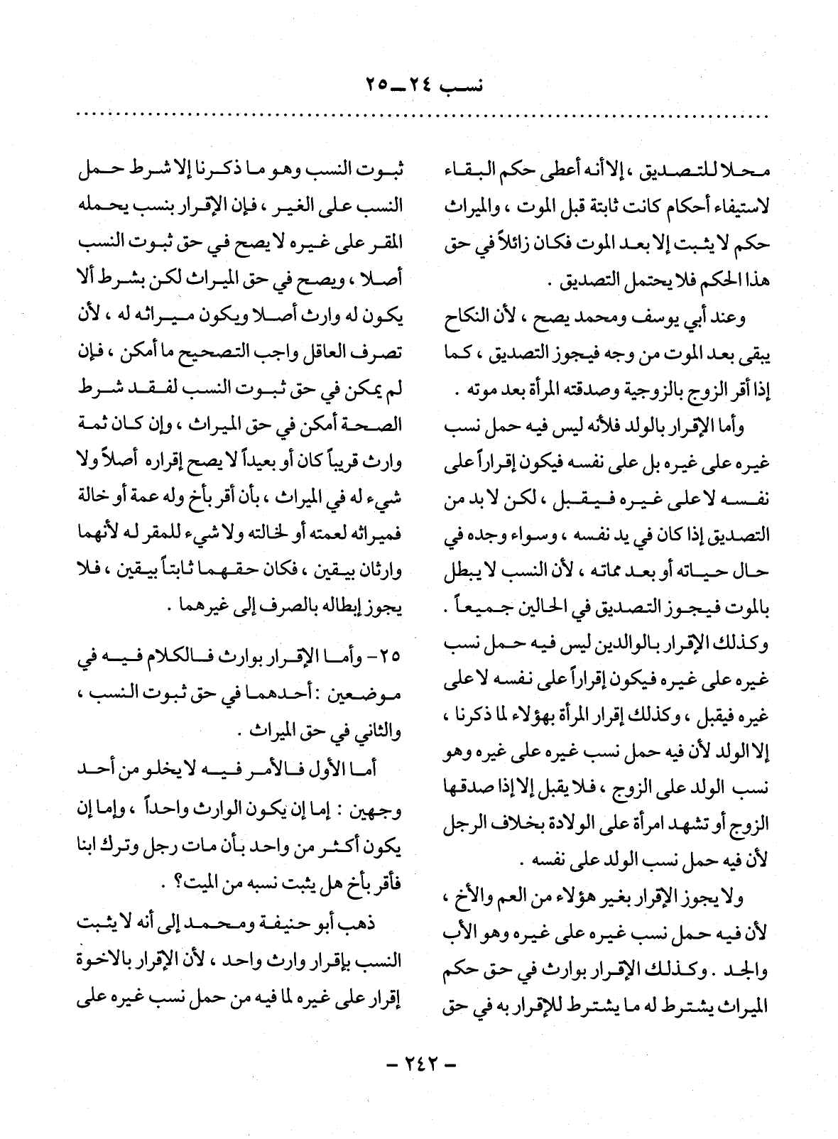 25 - وَأَمَّا الإِْقْرَارُ بِوَارِثٍ فَالْكَلاَمُ فِيهِ فِي مَوْضِعَيْنِ: أَحَدُهُمَا فِي حَقِّ ثُبُوتِ النَّسَبِ، وَالثَّانِي فِي حَقِّ الْمِيرَاثِ. أَمَّا الأَْوَّل فَالأَْمْرُ فِيهِ لاَ يَخْلُو مِنْ أَحَدِ وَجْهَيْنِ: إِمَّا أَنْ يَكُونَ الْوَارِثُ وَاحِدًا، وَإِمَّا أَنْ يَكُونَ أَكْثَرَ مِنْ وَاحِدٍ بِأَنْ مَاتَ رَجُلٌ وَتَرَكَ ابْنًا فَأَقَرَّ بِأَخٍ هَل يَثْبُتُ نَسَبُهُ مِنَ الْمَيِّتِ؟ ذَهَبَ أَبُو حَنِيفَةَ وَمُحَمَّدٌ إِلَى أَنَّهُ لاَ يَثْبُتُ النَّسَبُ بِإِقْرَارِ وَارِثٍ وَاحِدٍ، لأَِنَّ الإِْقْرَارَ بِالأُْخُوَّةِ إِقْرَارٌ عَلَى غَيْرِهِ لِمَا فِيهِ مِنْ حَمْل نَسَبِ غَيْرِهِ عَلَى