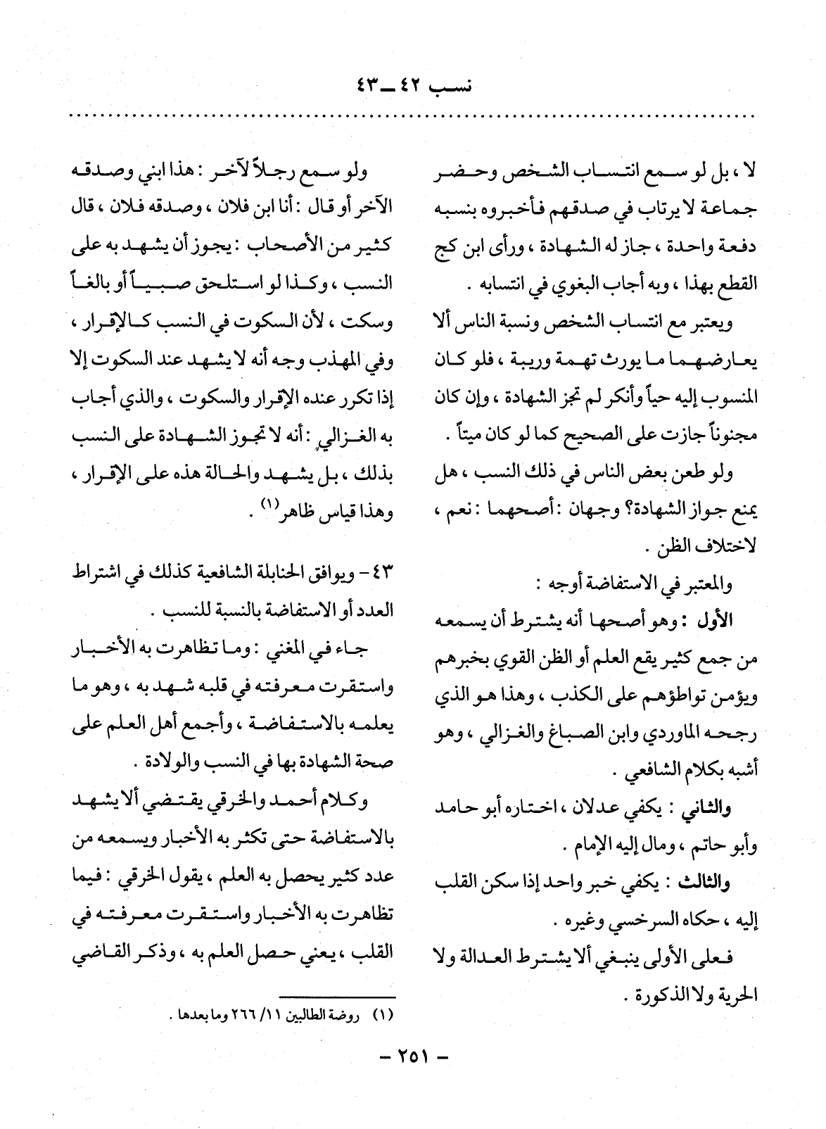 وَيُعْتَبَرُ مَعَ انْتِسَابِ الشَّخْصِ وَنِسْبَةِ النَّاسِ أَلاَّ يُعَارِضَهُمَا مَا يُورِثُ تُهْمَةً وَرِيبَةً، فَلَوْ كَانَ الْمَنْسُوبُ إِلَيْهِ حَيًّا وَأَنْكَرَ لَمْ تَجُزِ الشَّهَادَةُ، وَإِنْ كَانَ مَجْنُونًا جَازَتْ عَلَى الصَّحِيحِ كَمَا لَوْ كَانَ مَيِّتًا. وَلَوْ طَعَنَ بَعْضُ النَّاسِ فِي ذَلِكَ النَّسَبِ، هَل يُمْنَعُ جَوَازُ الشَّهَادَةِ؟ وَجْهَانِ: أَصَحُّهُمَا: نَعَمْ، لاِخْتِلاَفِ الظَّنِّ.