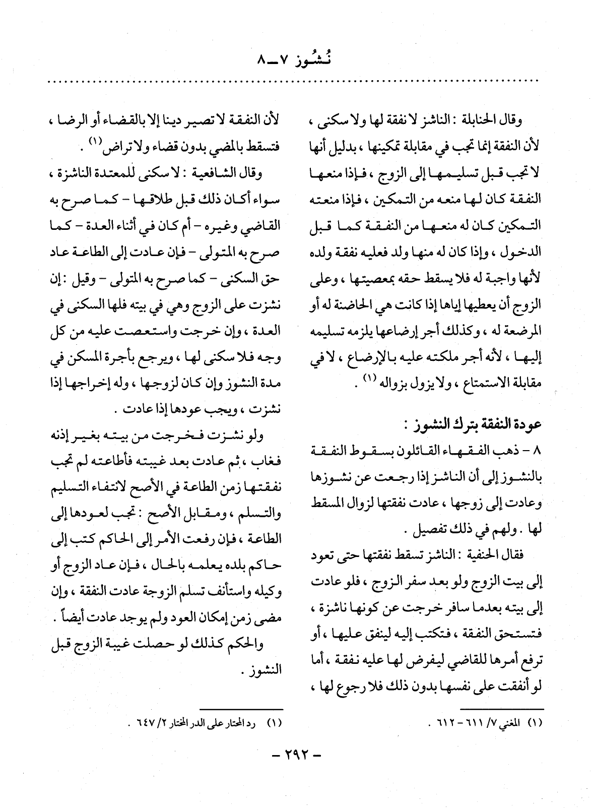 8 - ذَهَبَ الْفُقَهَاءُ الْقَائِلُونَ بِسُقُوطِ النَّفَقَةِ بِالنُّشُوزِ إِلَى أَنَّ النَّاشِزَ إِذَا رَجَعَتْ عَنْ نُشُوزِهَا وَعَادَتْ إِلَى زَوْجِهَا، عَادَتْ نَفَقَتُهَا لِزَوَال الْمُسْقِطِ لَهَا. وَلَهُمْ فِي ذَلِكَ تَفْصِيلٌ.