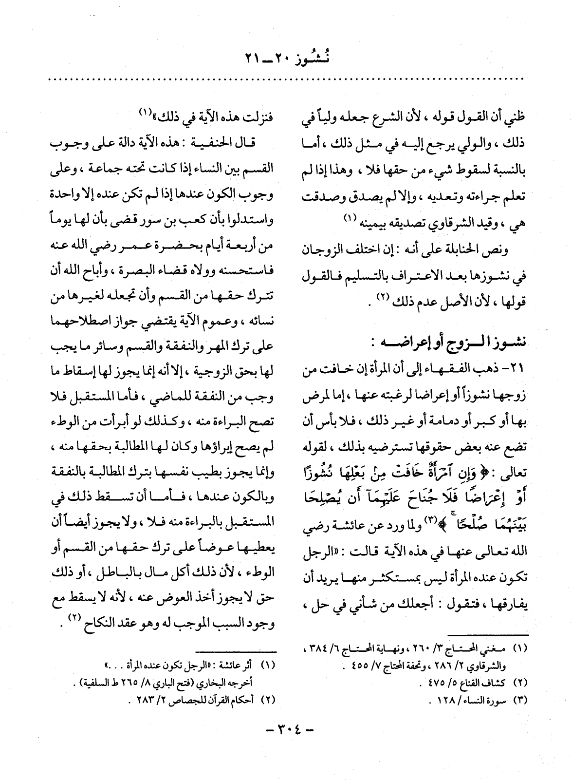21 - ذَهَبَ الْفُقَهَاءُ إِلَى أَنَّ الْمَرْأَةَ إِنْ خَافَتْ مِنْ زَوْجِهَا نُشُوزًا أَوْ إِعْرَاضًا لِرَغْبَتِهِ عَنْهَا، إِمَّا لِمَرَضٍ بِهَا أَوْ كِبَرٍ أَوْ دَمَامَةٍ أَوْ غَيْرِ ذَلِكَ، فَلاَ بَأْسَ أَنْ تَضَعَ عَنْهُ بَعْضَ حُقُوقِهَا تَسْتَرْضِيَهُ بِذَلِكَ، لِقَوْلِهِ تَعَالَى: وَإِنِ امْرَأَةٌ خَافَتْ مِنْ بَعْلِهَا نُشُوزًا أَوْ إِعْرَاضًا فَلاَ جُنَاحَ عَلَيْهِمَا أَنْ يُصْلِحَا (3) وَلِمَا وَرَدَ عَنْ عَائِشَةَ رَضِيَ اللَّهُ تَعَالَى عَنْهَا فِي هَذِهِ الآْيَةِ قَالَتِ: " الرَّجُل تَكُونُ عِنْدَهُ الْمَرْأَةُ لَيْسَ بِمُسْتَكْثِرٍ مِنْهَا يُرِيدُ أَنْ يُفَارِقَهَا، فَتَقُول: أَجْعَلُكَ مِنْ شَأْنِي فِي حِلٍّ،
