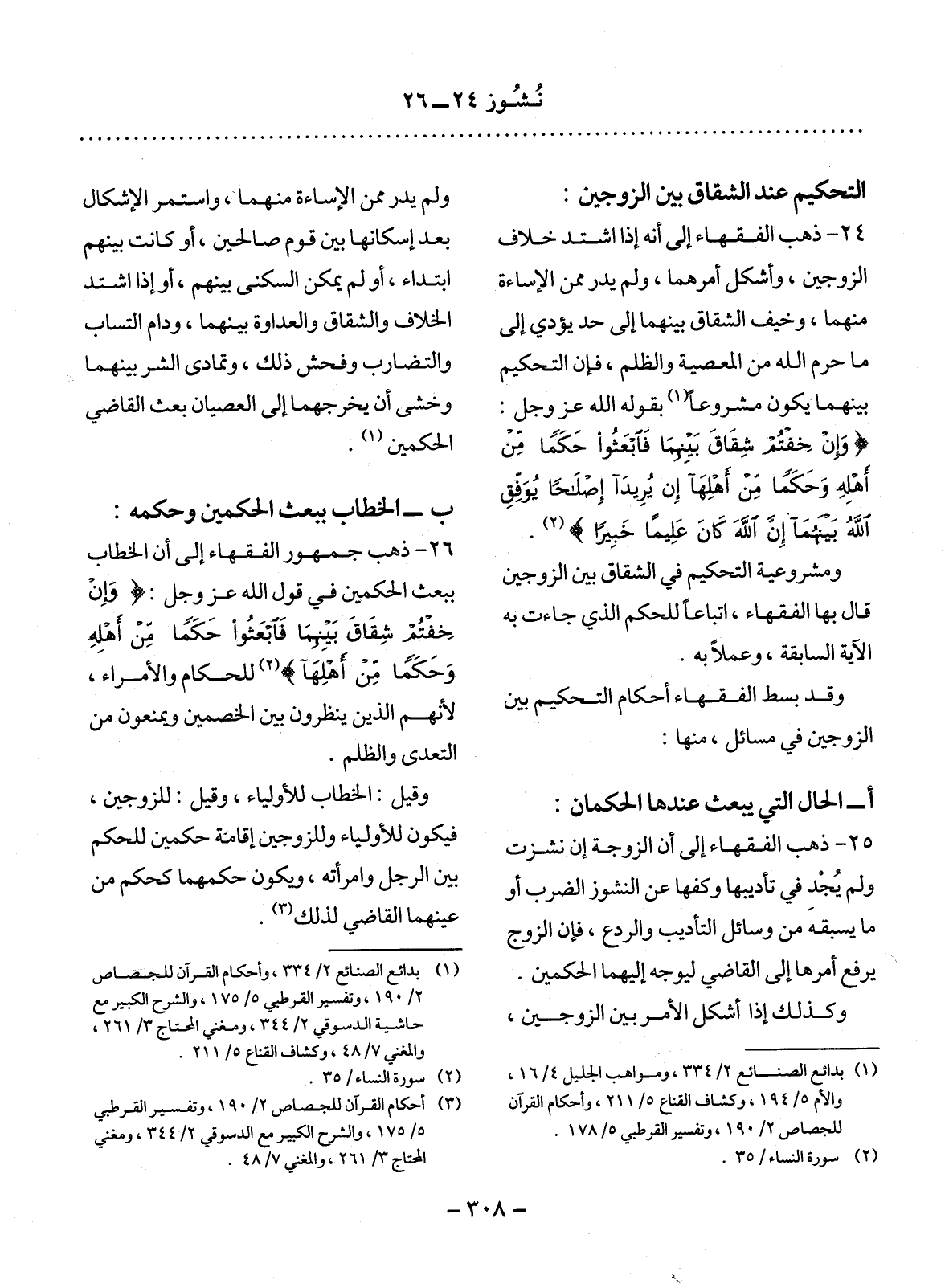 25 - ذَهَبَ الْفُقَهَاءُ إِلَى أَنَّ الزَّوْجَةَ إِنْ نَشَزَتْ وَلَمْ يُجْدِ فِي تَأْدِيبِهَا وَكَفِّهَا عَنِ النُّشُوزِ الضَّرْبُ أَوْ مَا يَسْبِقُهُ مِنْ وَسَائِل التَّأْدِيبِ وَالرَّدْعِ، فَإِنَّ الزَّوْجَ يَرْفَعُ أَمْرَهَا إِلَى الْقَاضِي لِيُوَجِّهَ إِلَيْهِمَا الْحَكَمَيْنِ.