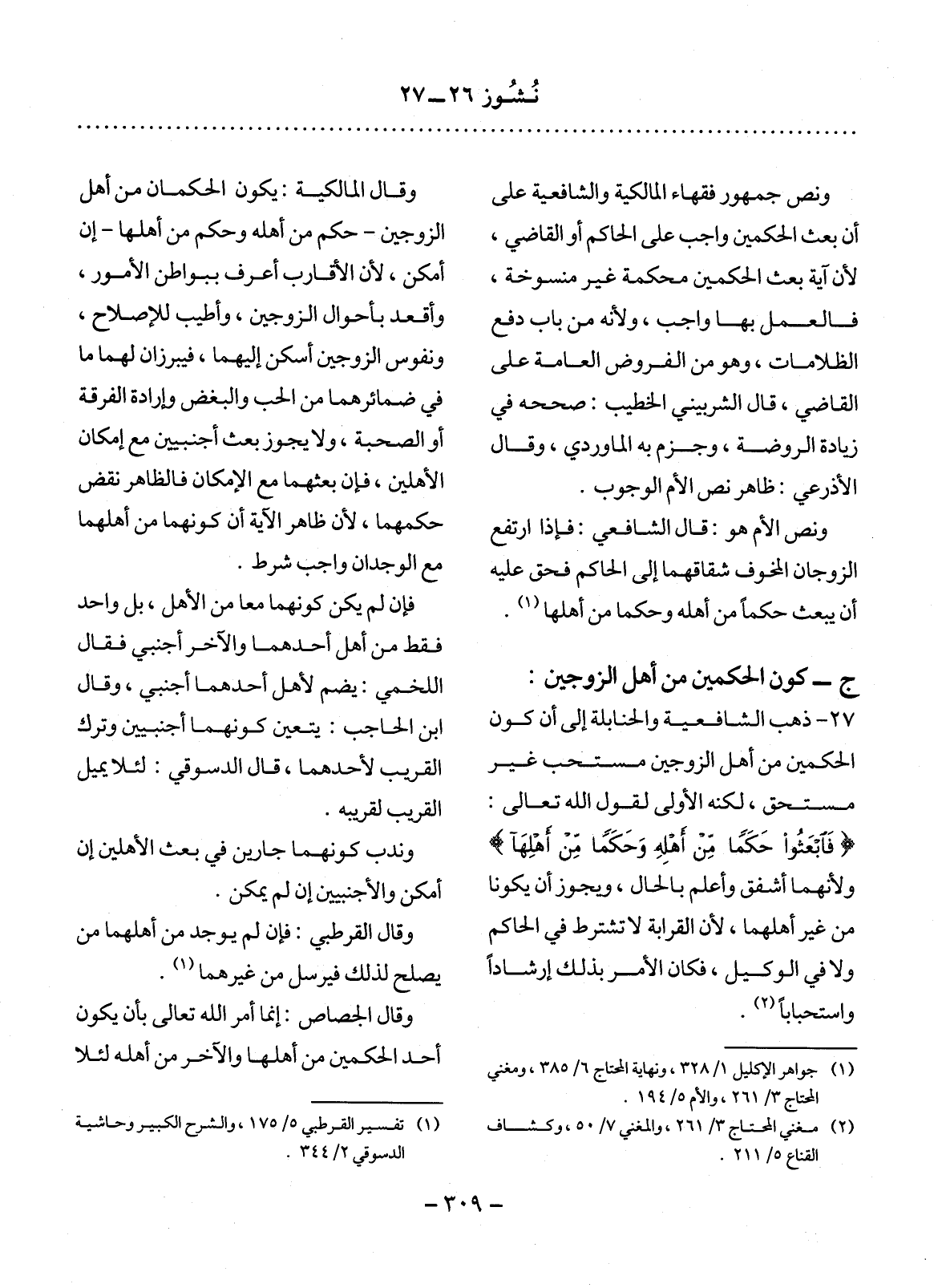 وَنَصَّ جُمْهُورُ فُقَهَاءِ الْمَالِكِيَّةِ وَالشَّافِعِيَّةِ عَلَى أَنَّ بَعْثَ الْحَكَمَيْنِ وَاجِبٌ عَلَى الْحَاكِمِ أَوِ الْقَاضِي؛ لأَِنَّ آيَةَ بَعْثِ الْحَكَمَيْنِ مُحْكَمَةٌ غَيْرُ مَنْسُوخَةٍ، فَالْعَمَل بِهَا وَاجِبٌ، وَلأَِنَّهُ مِنْ بَابِ دَفْعِ الظِّلاَمَاتِ، وَهُوَ مِنَ الْفُرُوضِ الْعَامَّةِ عَلَى الْقَاضِي، " قَال الشِّرْبِينِيُّ الْخَطِيبُ: صَحَّحَهُ فِي زِيَادَةِ الرَّوْضَةِ، وَجَزَمَ بِهِ الْمَاوَرْدِيُّ، وَقَال الأَْذْرُعِيُّ: ظَاهِرُ نَصِّ الأُْمِّ الْوُجُوبُ.