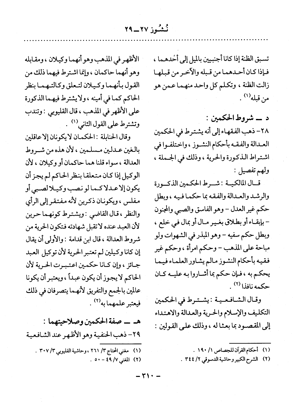 28 - ذَهَبَ الْفُقَهَاءُ إِلَى أَنَّهُ يُشْتَرَطُ فِي الْحَكَمَيْنِ الْعَدَالَةُ وَالْفِقْهُ بِأَحْكَامِ النُّشُوزِ، وَاخْتَلَفُوا فِي اشْتِرَاطِ الذُّكُورَةِ وَالْحُرِّيَّةِ، وَذَلِكَ فِي الْجُمْلَةِ، وَلَهُمْ تَفْصِيلٌ: