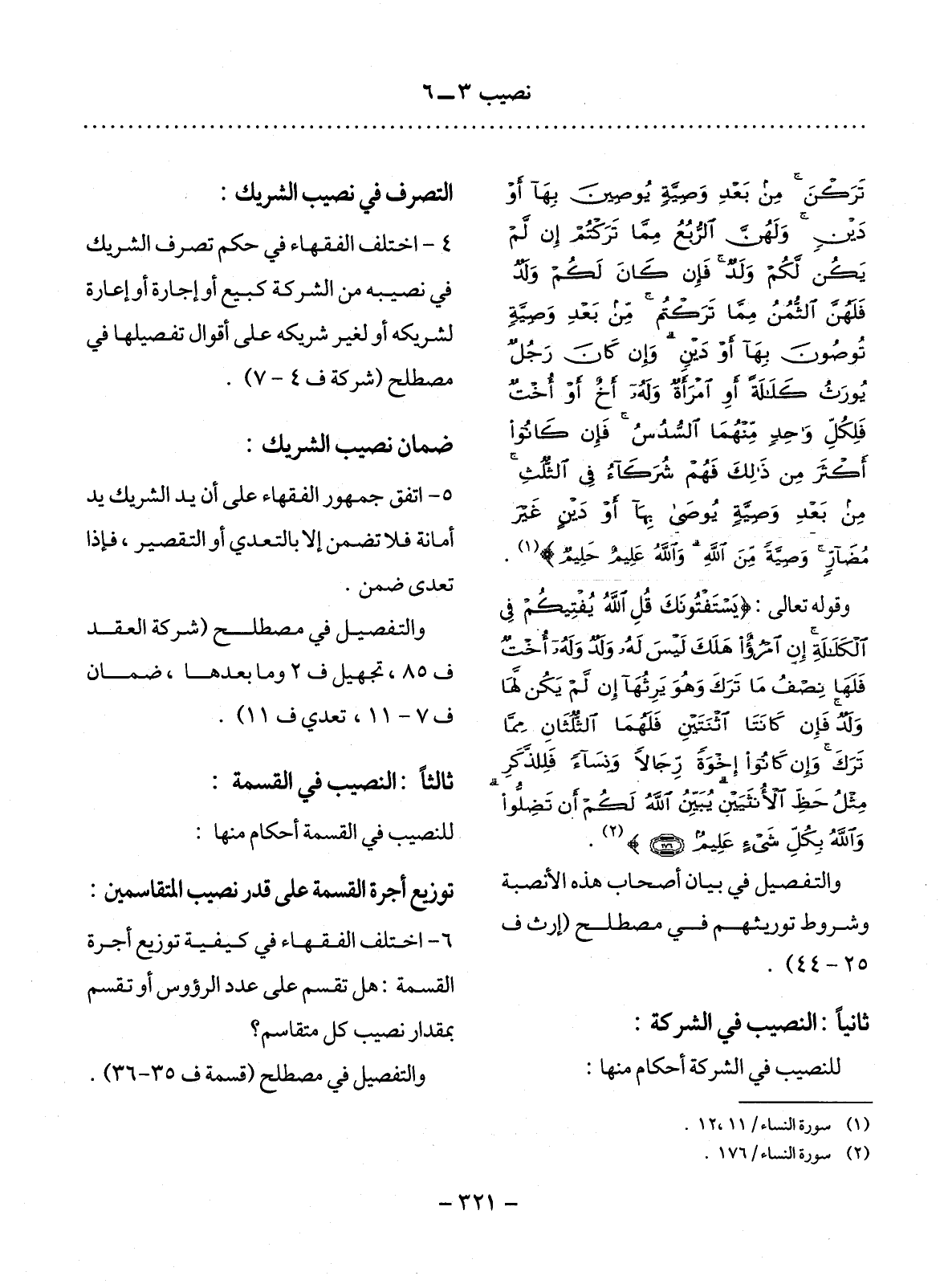 وَقَوْلُهُ تَعَالَى: يَسْتَفْتُونَكَ قُل اللَّهُ يُفْتِيكُمْ فِي الْكَلاَلَةِ إِنِ امْرُؤٌ هَلَكَ لَيْسَ لَهُ وَلَدٌ وَلَهُ أُخْتٌ فَلَهَا نِصْفُ مَا تَرَكَ وَهُوَ يَرِثُهَا إِنْ لَمْ يَكُنْ لَهَا وَلَدٌ فَإِنْ كَانَتَا اثْنَتَيْنِ فَلَهُمَا الثُّلُثَانِ مِمَّا تَرَكَ وَإِنْ كَانُوا إِخْوَةً رِجَالاً وَنِسَاءً فَلِلذَّكَرِ مِثْل حَظِّ الأُْنْثَيَيْنِ يُبَيِّنُ اللَّهُ لَكُمْ أَنْ تَضِلُّوا وَاللَّهُ بِكُل شَيْءٍ عَلِيمٌ (2) وَالتَّفْصِيل فِي بَيَانِ أَصْحَابِ هَذِهِ الأَْنْصِبَةِ وَشُرُوطِ تَوْرِيثِهِمْ فِي مُصْطَلَحِ (إِرْث ف 25 - 44) .