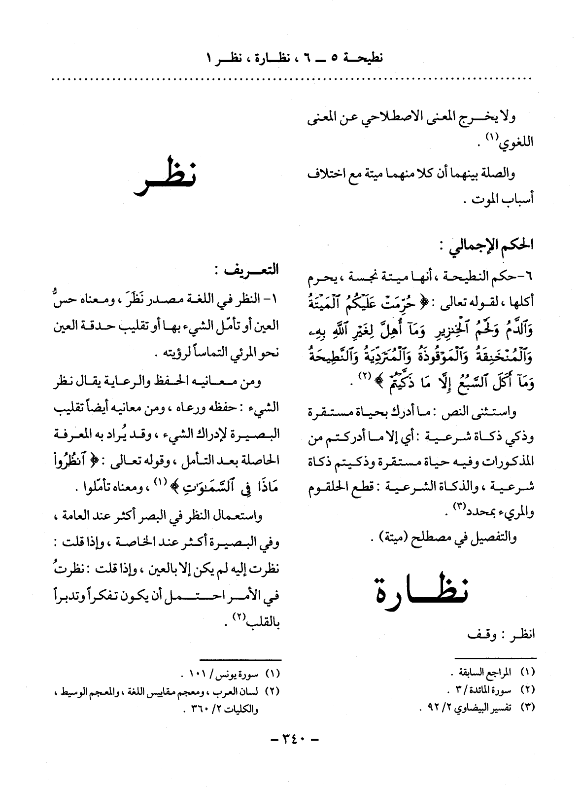 6 - حُكْمُ النَّطِيحَةِ، أَنَّهَا مَيْتَةٌ نَجِسَةٌ، يَحْرُمُ أَكْلُهَا، لِقَوْلِهِ تَعَالَى: حُرِّمَتْ عَلَيْكُمُ الْمَيْتَةُ وَالدَّمُ وَلَحْمُ الْخِنْزِيرِ وَمَا أُهِل لِغَيْرِ اللَّهِ بِهِ وَالْمُنْخَنِقَةُ وَالْمَوْقُوذَةُ وَالْمُتَرَدِّيَةُ وَالنَّطِيحَةِ وَمَا أَكَل السَّبُعُ إِلاَّ مَا ذَكَّيْتُمْ (2) .