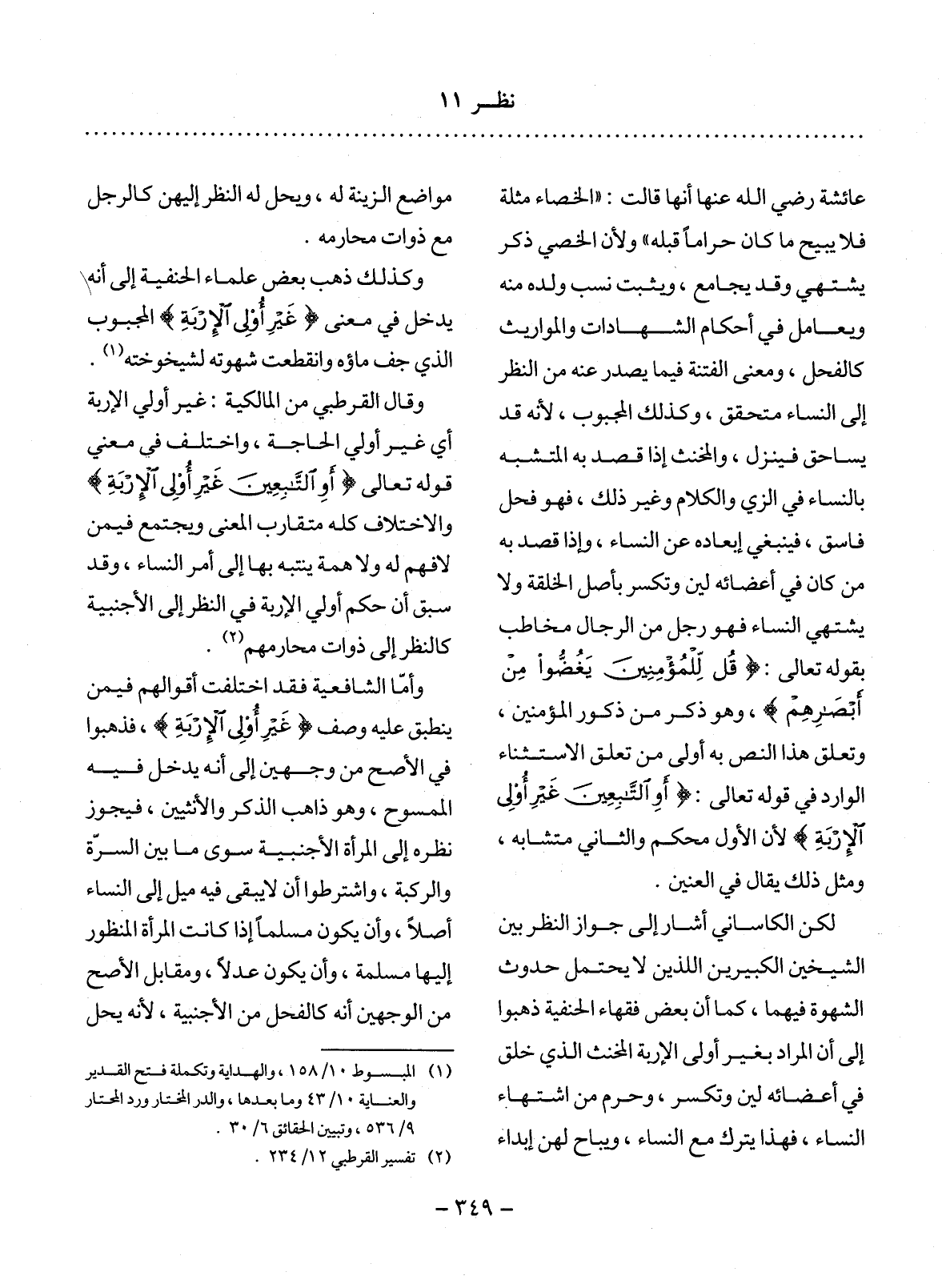 عَائِشَةَ رَضِيَ اللَّهُ عَنْهَا أَنَّهَا قَالَتْ: الْخِصَاءُ مُثْلَةٌ فَلاَ يُبِيحُ مَا كَانَ حَرَامًا قَبْلَهُ وَلأَِنَّ الْخَصِيَّ ذَكَرٌ يَشْتَهِي وَقَدْ يُجَامِعُ، وَيَثْبُتُ نَسَبُ وَلَدِهِ مِنْهُ وَيُعَامَل فِي أَحْكَامِ الشَّهَادَاتِ وَالْمَوَارِيثِ كَالْفَحْل، وَمَعْنَى الْفِتْنَةِ فِيمَا يَصْدُرُ عَنْهُ مِنَ النَّظَرِ إِلَى النِّسَاءِ مُتَحَقِّقٌ، وَكَذَلِكَ الْمَجْبُوبُ، لأَِنَّهُ قَدْ يُسَاحِقُ فَيُنْزِل، وَالْمُخَنَّثُ إِذَا قُصِدَ بِهِ الْمُتَشَبِّهُ بِالنِّسَاءِ فِي الزِّيِّ وَالْكَلاَمِ وَغَيْرِ ذَلِكَ، فَهُوَ فَحْلٌ فَاسِقٌ، فَيَنْبَغِي إِبْعَادُهُ عَنِ النِّسَاءِ، وَإِذَا قُصِدَ بِهِ مَنْ كَانَ فِي أَعْضَائِهِ لِينٌ وَتَكَسُّرٌ بِأَصْل الْخِلْقَةِ وَلاَ يَشْتَهِي النِّسَاءَ فَهُوَ رَجُلٌ مِنَ الرِّجَال مُخَاطَبٌ بِقَوْلِهِ تَعَالَى: قُل لِلْمُؤْمِنِينَ يَغُضُّوا مِنْ أَبْصَارِهِمْ، وَهُوَ ذَكَرٌ مِنْ ذُكُورِ الْمُؤْمِنِينَ، وَتَعَلُّقُ هَذَا النَّصِّ بِهِ أَوْلَى مِنْ تَعَلُّقِ الاِسْتِثْنَاءِ الْوَارِدِ فِي قَوْلِهِ تَعَالَى: أَوِ التَّابِعِينَ غَيْرِ أُولِي الإِْرْبَةِ لأَِنَّ الأَْوَّل مُحْكَمٌ وَالثَّانِيَ مُتَشَابِهٌ، وَمِثْل ذَلِكَ يُقَال فِي الْعِنِّينِ.