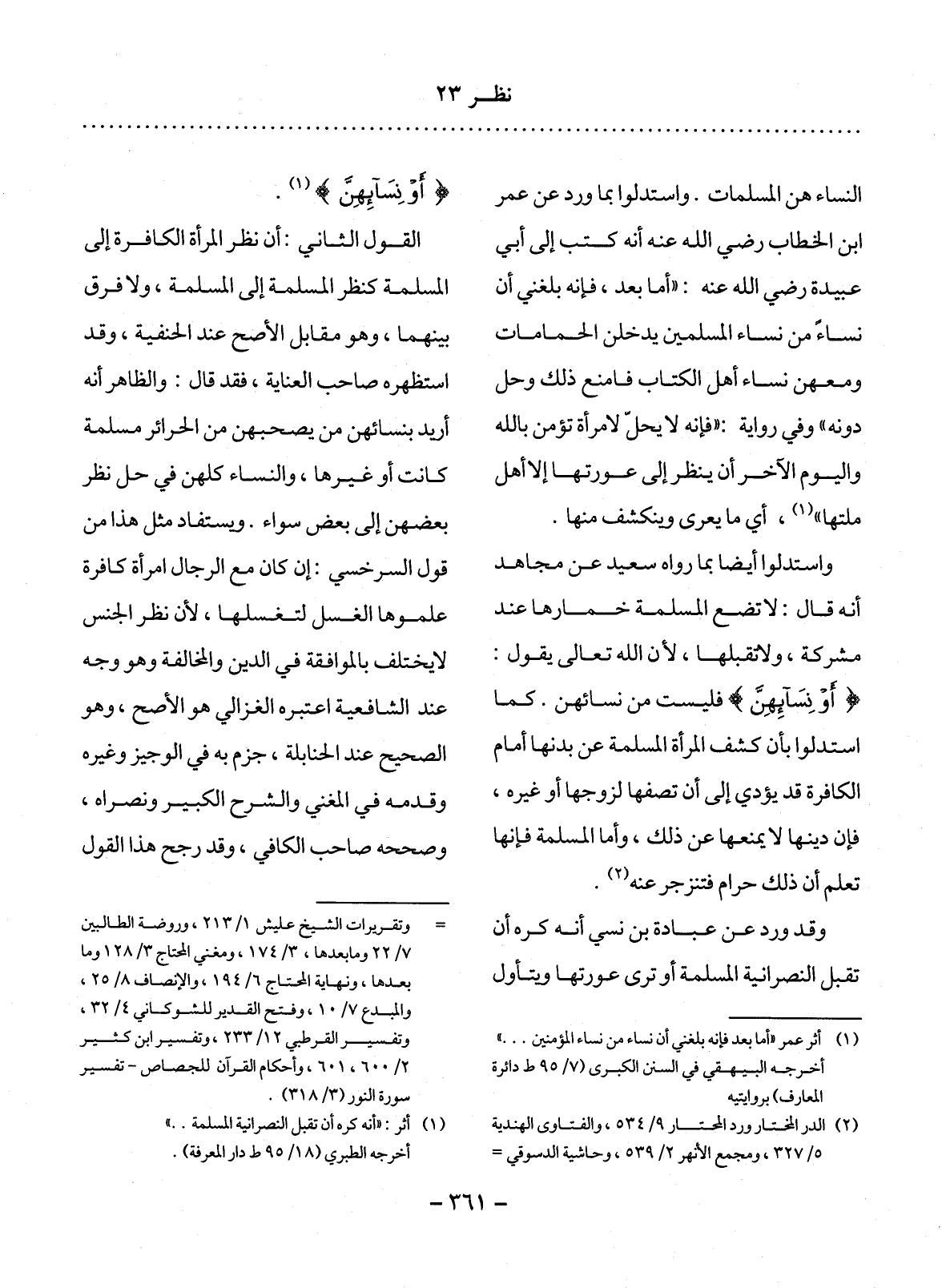 النِّسَاءِ هُنَّ الْمُسْلِمَاتُ. وَاسْتَدَلُّوا بِمَا وَرَدَ عَنِِ عُمَرَ بْنِ الْخَطَّابِ رَضِيَ اللَّهُ عَنْهُ أَنَّهُ كَتَبَ إِلَى أَبِي عُبَيْدَةَ رَضِيَ اللَّهُ عَنْهُ: أَمَّا بَعْدُ، فَإِنَّهُ بَلَغَنِي أَنَّ نِسَاءً مِنْ نِسَاءِ الْمُسْلِمِينَ يَدْخُلْنَ الْحَمَّامَاتِ وَمَعَهُنَّ نِسَاءُ أَهْل الْكِتَابِ فَامْنَعْ ذَلِكَ وَحُل دُونَهُ وَفِي رِوَايَةٍ: فَإِنَّهُ لاَ يَحِل لاِمْرَأَةٍ تُؤْمِنُ بِاللَّهِ وَالْيَوْمِ الآْخِرِ أَنْ يَنْظُرَ إِلَى عَوْرَتِهَا إِلاَّ أَهْل مِلَّتِهَا (1) ، أَيْ مَا يُعَرَّى وَيَنْكَشِفُ مِنْهَا.