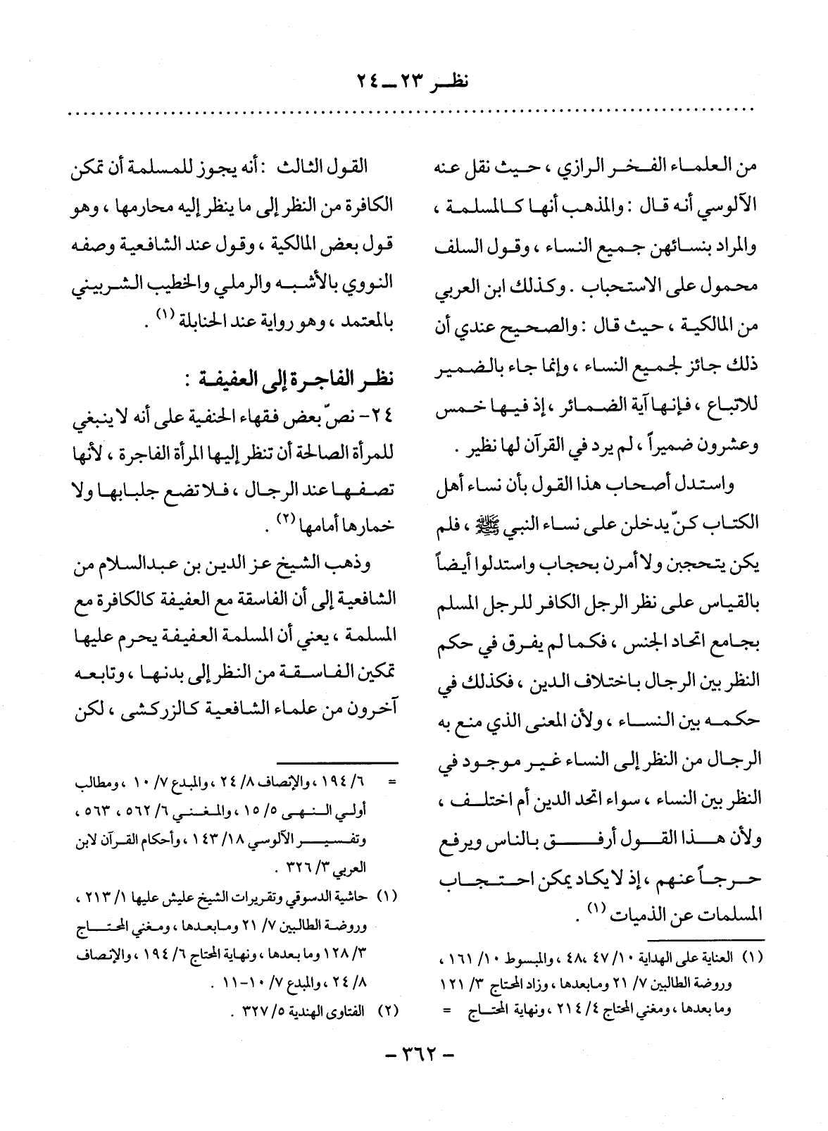 24 - نَصَّ بَعْضُ فُقَهَاءِ الْحَنَفِيَّةِ عَلَى أَنَّهُ لاَ يَنْبَغِي لِلْمَرْأَةِ الصَّالِحَةِ أَنْ تَنْظُرَ إِلَيْهَا الْمَرْأَةُ الْفَاجِرَةُ، لأَِنَّهَا تَصِفُهَا عِنْدَ الرِّجَال، فَلاَ تَضَعُ جِلْبَابَهَا وَلاَ خِمَارَهَا أَمَامَهَا (2) .