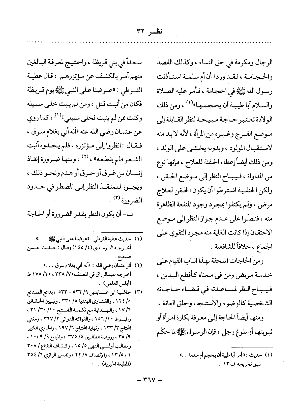 الرِّجَال وَمَكْرُمَةٌ فِي حَقِّ النِّسَاءِ، وَكَذَلِكَ الْفَصْدُ وَالْحِجَامَةُ، فَقَدْ وَرَدَ أَنَّ أُمَّ سَلَمَةَ اسْتَأْذَنَتْ رَسُول اللَّهِ - صَلَّى اللَّهُ عَلَيْهِ وَسَلَّمَ - فِي الْحِجَامَةِ، فَأَمَرَ عَلَيْهِ الصَّلاَةُ وَالسَّلاَمُ أَبَا طَيْبَةَ أَنْ يُحْجِمَهَا (1) ، وَمِنْ ذَلِكَ الْوِلاَدَةُ تُعْتَبَرُ حَاجَةً مُبِيحَةً لِنَظَرِ الْقَابِلَةِ إِلَى مَوْضِعِ الْفَرْجِ وَغَيْرِهِ مِنَ الْمَرْأَةِ، لأَِنَّهُ لاَبُدَ مِنْهُ لاِسْتِقْبَال الْمَوْلُودِ، وَبِدُونِهِ يُخْشَى عَلَى الْوَلَدِ، وَمِنْ ذَلِكَ أَيْضًا إِعْطَاءُ الْحُقْنَةِ لِلْعِلاَجِ، فَإِنَّهَا نَوْعٌ مِنَ الْمُدَاوَاةِ، فَيُبَاحُ النَّظَرُ إِلَى مَوْضِعِ الْحَقْنِ، وَلَكِنَّ الْحَنَفِيَّةَ اشْتَرَطُوا أَنْ يَكُونَ الْحَقْنُ لِعِلاَجِ مَرَضٍ، وَلَمْ يَكْتَفُوا بِمُجَرَّدِ وُجُودِ الْمَنْفَعَةِ الظَّاهِرَةِ مِنْهُ، فَنَصُّوا عَلَى عَدَمِ جَوَازِ النَّظَرِ إِلَى مَوْضِعِ الاِحْتِقَانِ إِذَا كَانَتِ الْغَايَةُ مِنْهُ مُجَرَّدَ التَّقَوِّي عَلَى الْجِمَاعِ، خِلاَفًا لِلشَّافِعِيَّةِ.