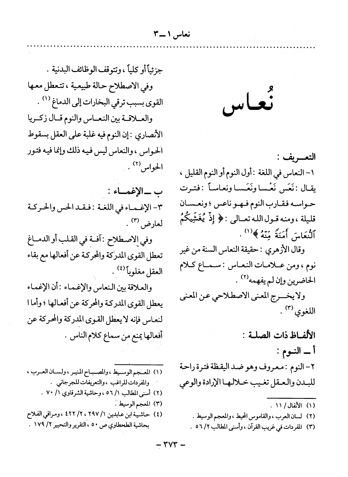 1 - النُّعَاسُ فِي اللُّغَةِ: أَوَّل النَّوْمِ أَوِ النَّوْمُ الْقَلِيل، يُقَال: نَعَسَ نَعْسًا وَنَعَسًا وَنُعَاسًا: فَتَرَتْ حَوَاسُّهُ فَقَارَبَ النَّوْمَ فَهُوَ نَاعِسٌ، وَنَعْسَانُ قَلِيلَةٌ، وَمِنْهُ قَوْل اللَّهِ تَعَالَى: إِذْ يُغَشِّيكُمُ النُّعَاسَ أَمَنَةً مِنْهُ (1) .