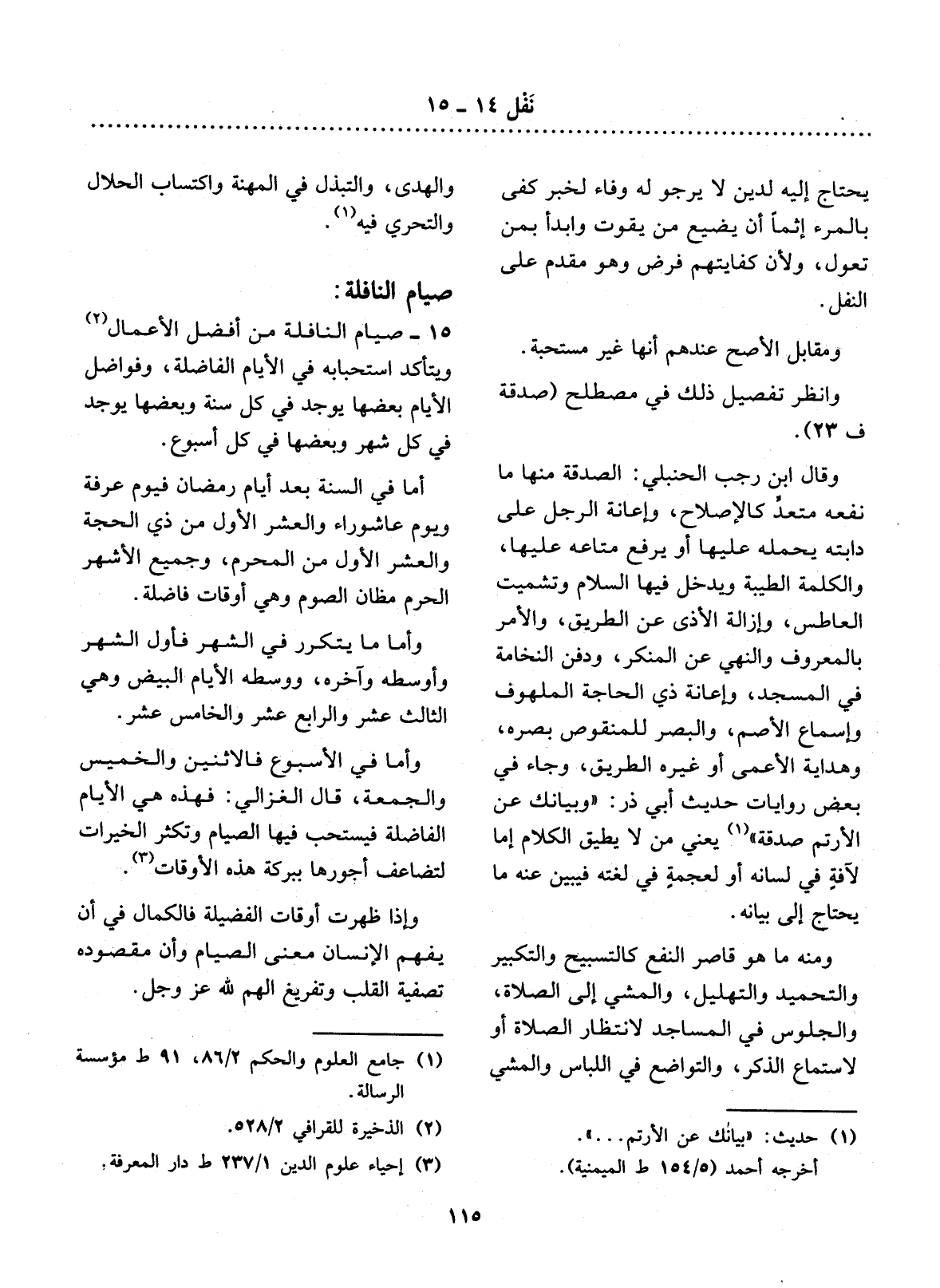 15 - صِيَامُ النَّافِلَةِ مِنْ أَفْضَل الأَْعْمَال (2) وَيَتَأَكَّدُ اسْتِحْبَابُهُ فِي الأَْيَّامِ الْفَاضِلَةِ، وَفَوَاضِل الأَْيَّامِ بَعْضُهَا يُوجَدُ فِي كُل سَنَةٍ وَبَعْضُهَا يُوجَدُ فِي كُل شَهْرٍ وَبَعْضُهَا فِي كُل أُسْبُوعٍ.