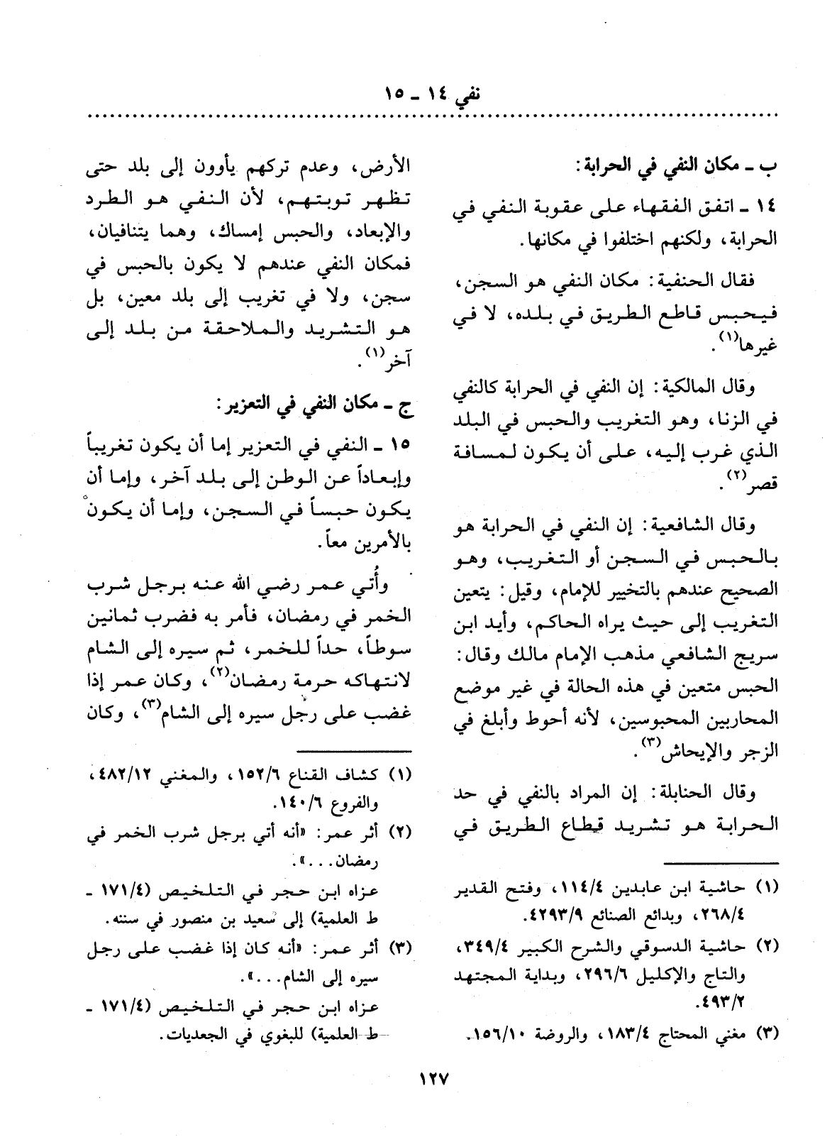 14 - اتَّفَقَ الْفُقَهَاءُ عَلَى عُقُوبَةِ النَّفْيِ فِي الْحِرَابَة، وَلَكِنَّهُمُ اخْتَلَفُوا فِي مَكَانِهَا.