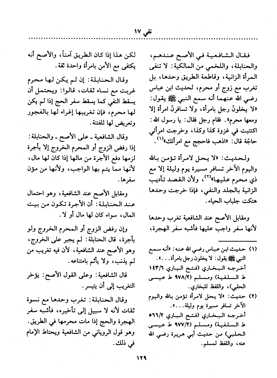 (2) حديث: " لا يحل لامرأة تؤمن بالله واليوم الآخر تسافر مسيرة يوم وليلة. . . ". أخرجه البخاري (فتح الباري 2 / 566 ط السلفية) ومسلم (2 / 977 ط عيسى الحلبي) من حديث أبي هريرة رضي الله عنه، واللفظ لمسلم.