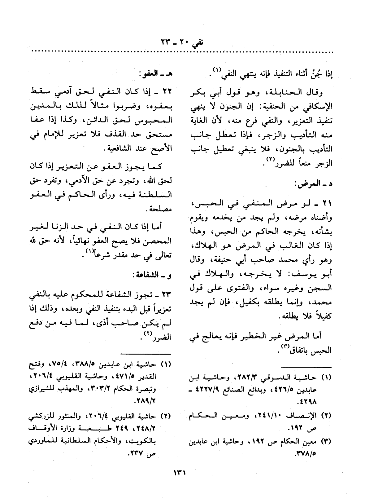23 - تَجُوزُ الشَّفَاعَةُ لِلْمَحْكُومِ عَلَيْهِ بِالنَّفْيِ تَعْزِيرًا قَبْل الْبَدْءِ بِتَنْفِيذِ النَّفْيِ وَبَعْدَهُ، وَذَلِكَ إِذَا لَمْ يَكُنْ صَاحِبَ أَذًى؛ لِمَا فِيهِ مِنْ دَفْعِ الضَّرَرِ (2) .