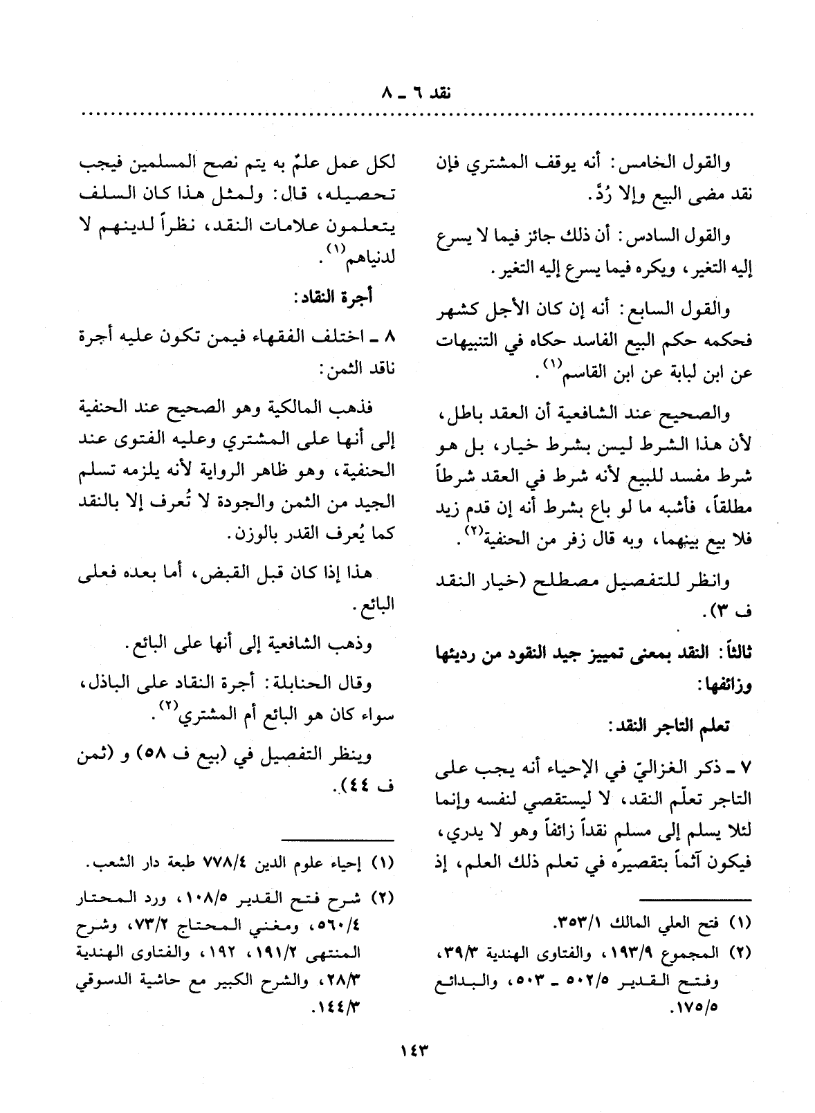 7 - ذَكَرَ الْغَزَالِيُّ فِي الإِْحْيَاءِ أَنَّهُ يَجِبُ عَلَى التَّاجِرِ تَعَلُّمُ النَّقْدِ، لاَ لِيَسْتَقْصِيَ لِنَفْسِهِ وَإِنَّمَا لِئَلاَّ يُسَلِّمَ إِلَى مُسْلِمٍ نَقْدًا زَائِفًا وَهُوَ لاَ يَدْرِي، فَيَكُونَ آثِمًا بِتَقْصِيرِهِ فِي تَعَلُّمِ ذَلِكَ الْعِلْمِ، إِذْ