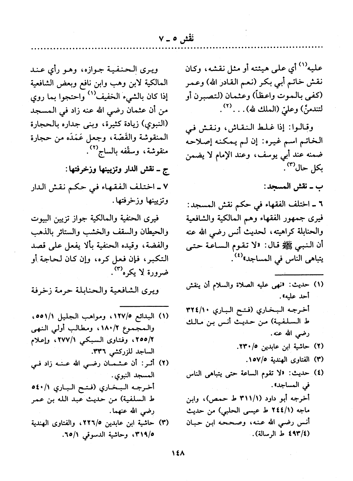وَاحْتَجُّوا بِمَا رُوِيَ مِنْ أَنَّ عُثْمَانَ رَضِيَ اللَّهُ عَنْهُ زَادَ فِي الْمَسْجِدِ (النَّبَوِيِّ) زِيَادَةً كَثِيرَةً، وَبَنَى جِدَارَهُ بِالْحِجَارَةِ الْمَنْقُوشَةِ وَالْقَصَّةِ، وَجَعَل عَمَدَهُ مِنْ حِجَارَةٍ مَنْقُوشَةٍ، وَسَقْفَهُ بِالسَّاجِ (2) .