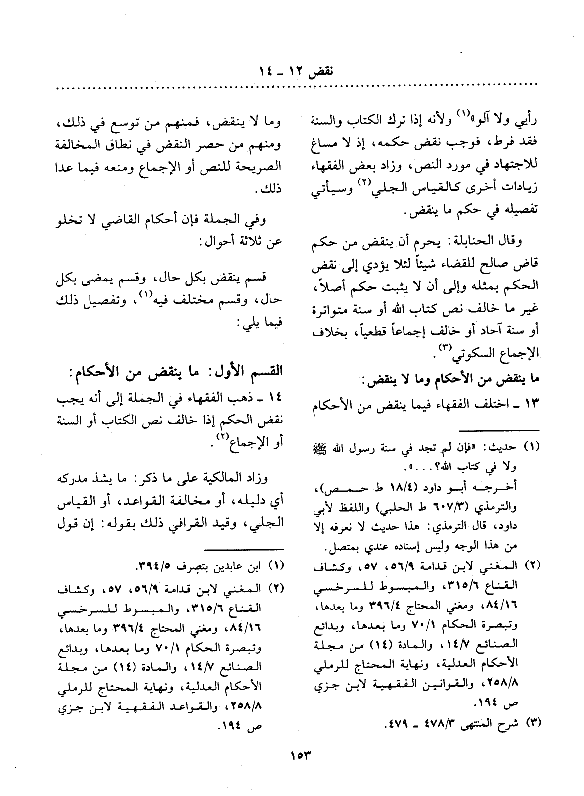 14 - ذَهَبَ الْفُقَهَاءُ فِي الْجُمْلَةِ إِلَى أَنَّهُ يَجِبُ نَقْضُ الْحُكْمِ إِذَا خَالَفَ نَصَّ الْكِتَابِ أَوِ السُّنَّةِ أَوِ الإِْجْمَاعَ (2) .