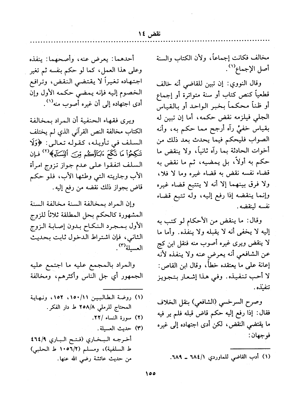 مُخَالِفٌ، فَكَانَتْ إِجْمَاعًا، وَلأَِنَّ الْكِتَابَ وَالسُّنَّةَ أَصْل الإِْجْمَاعِ (1) . وَقَال النَّوَوِيُّ: إِنْ تَبَيَّنَ لِلْقَاضِي أَنَّهُ خَالَفَ قَطْعِيًّا كَنَصِّ كِتَابٍ أَوْ سُنَّةٍ مُتَوَاتِرَةٍ أَوْ إِجْمَاعٍ، أَوْ ظَنًّا مُحْكَمًا بِخَبَرِ الْوَاحِدِ أَوْ بِالْقِيَاسِ الْجَلِيِّ، فَيَلْزَمُهُ نَقْضُ حُكْمِهِ، أَمَّا إِنْ تَبَيَّنَ لَهُ بِقِيَاسٍ خَفِيٍّ رَآهُ أَرْجَحَ مِمَّا حَكَمَ بِهِ وَأَنَّهُ الصَّوَابُ، فَلْيَحْكُمْ فِيمَا يَحْدُثُ بَعْدَ ذَلِكَ مِنْ أَخَوَاتِ الْحَادِثَةِ بِمَا رَآهُ ثَانِيًا، وَلاَ يَنْقُضُ مَا حَكَمَ بِهِ أَوَّلاً، بَل يُمْضِيهِ، ثُمَّ مَا نَقَضَ بِهِ قَضَاءَ نَفْسِهِ نَقَضَ بِهِ قَضَاءَ غَيْرِهِ، وَمَا لاَ فَلاَ، وَلاَ فَرْقَ بَيْنَهُمَا إِلاَّ أَنَّهُ لاَ يَتَتَبَّعُ قَضَاءَ غَيْرِهِ، وَإِنَّمَا يَنْقُضُهُ إِذَا رُفِعَ إِلَيْهِ، وَلَهُ تَتَبُّعُ قَضَاءِ نَفْسِهِ لِيَنْقُضَهُ.