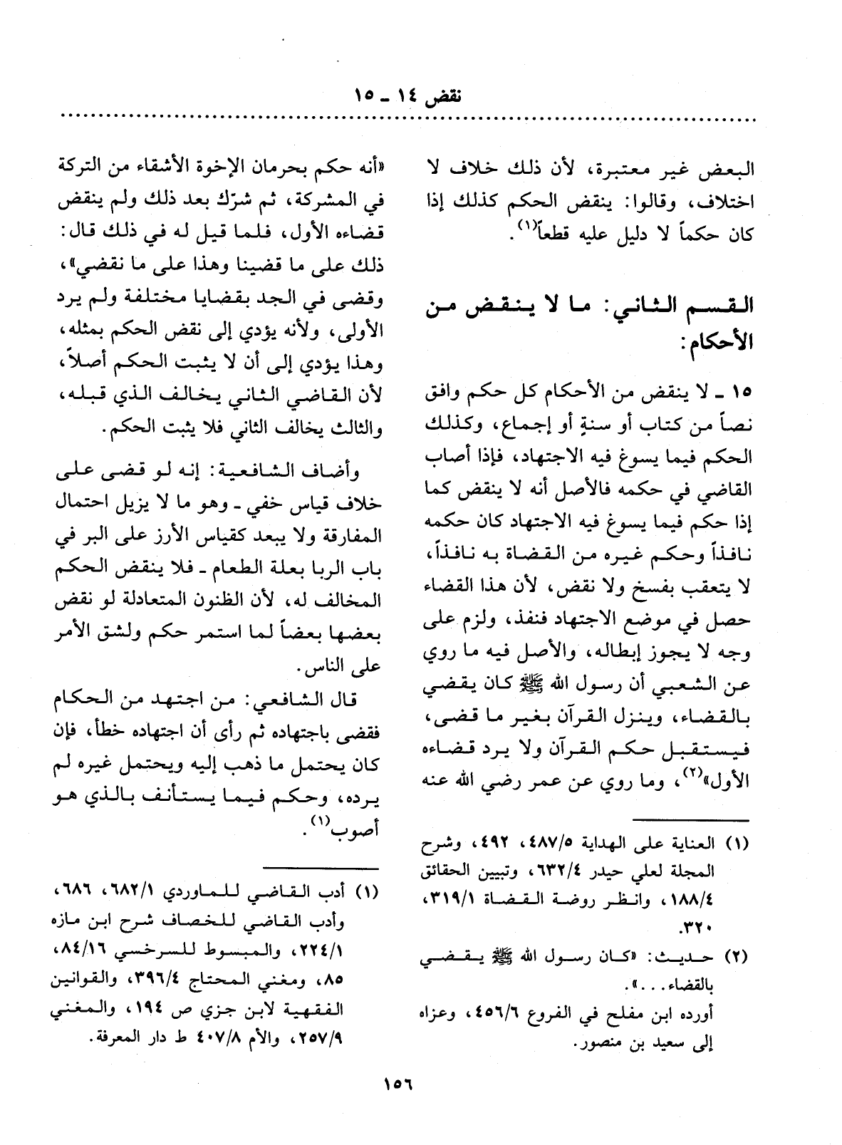 15 - لاَ يُنْقَضُ مِنَ الأَْحْكَامِ كُل حُكْمٍ وَافَقَ نَصًّا مِنْ كِتَابٍ أَوْ سُنَّةٍ أَوْ إِجْمَاعٍ، وَكَذَلِكَ الْحُكْمُ فِيمَا يَسُوغُ فِيهِ الاِجْتِهَادُ، فَإِذَا أَصَابَ الْقَاضِي فِي حُكْمِهِ فَالأَْصْل أَنَّهُ لاَ يُنْقَضُ كَمَا إِذَا حَكَمَ فِيمَا يَسُوغُ فِيهِ الاِجْتِهَادُ كَانَ حُكْمُهُ نَافِذًا وَحُكْمُ غَيْرِهِ مِنَ الْقُضَاةِ بِهِ نَافِذًا، لاَ يُتَعَقَّبُ بِفَسْخٍ وَلاَ نَقْضٍ، لأَِنَّ هَذَا الْقَضَاءَ حَصَل فِي مَوْضِعِ الاِجْتِهَادِ فَنَفَذَ، وَلَزِمَ عَلَى وَجْهٍ لاَ يَجُوزُ إِبْطَالُهُ، وَالأَْصْل فِيهِ مَا رُوِيَ عَنِ الشَّعْبِيِّ أَنَّ رَسُول اللَّهِ صَلَّى اللَّهُ عَلَيْهِ وَسَلَّمَ كَانَ يَقْضِي بِالْقَضَاءِ، وَيَنْزِل الْقُرْآنُ بِغَيْرِ مَا قَضَى، فَيَسْتَقْبِل حُكْمَ الْقُرْآنِ وَلاَ يَرُدُّ قَضَاءَهُ الأَْوَّل (2) ، وَمَا رُوِيَ عَنْ عُمَرَ رَضِيَ اللَّهُ عَنْهُ