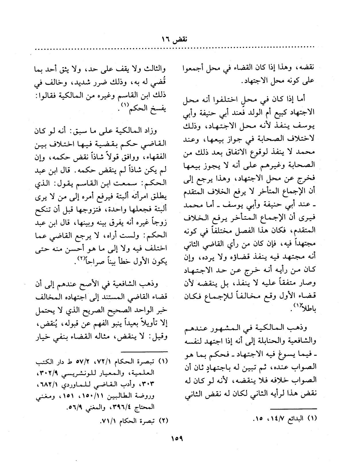 (1) تبصرة الحكام 1 / 72، 2 / 57 ط دار الكتب العلمية، والمعيار للونشريسي 9 / 302، 303، وأدب القاضي للماوردي 1 / 682، وروضة الطالبين 11 / 150، 151، ومغني المحتاج 4 / 396، والمغني 9 / 56.