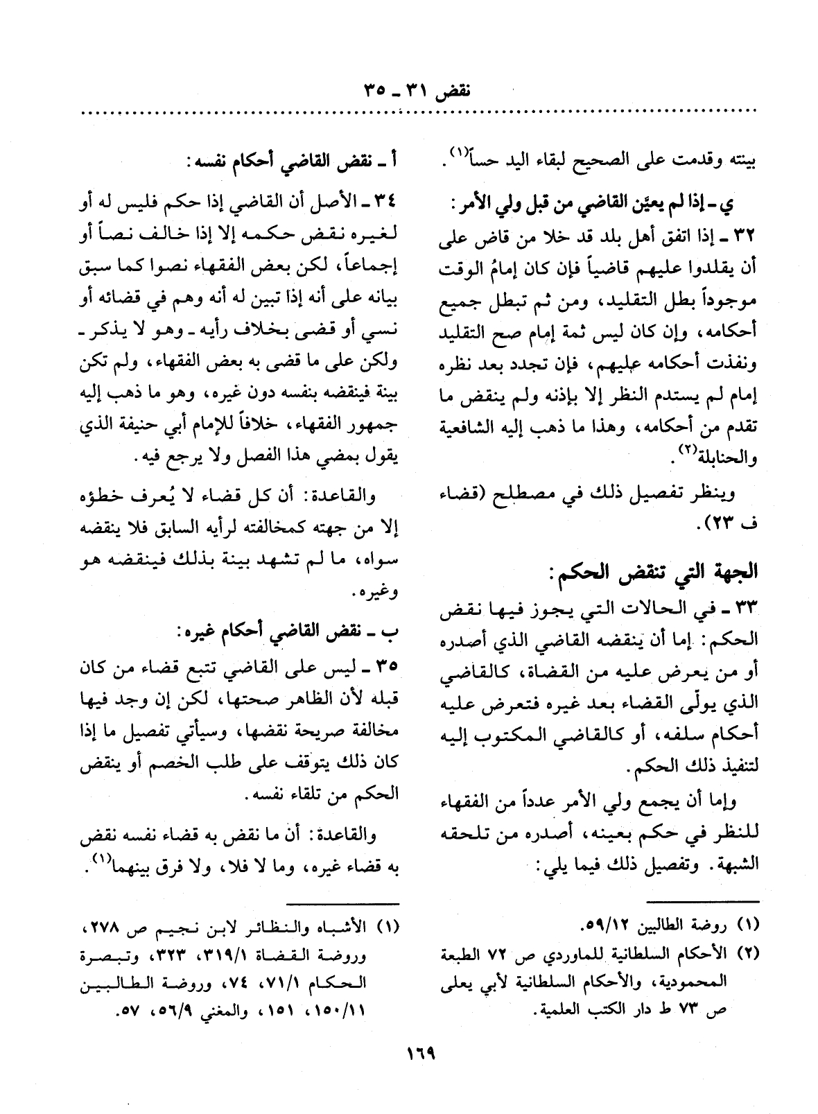 33 - فِي الْحَالاَتِ الَّتِي يَجُوزُ فِيهَا نَقْضُ الْحُكْمِ: إِمَّا أَنْ يَنْقُضَهُ الْقَاضِي الَّذِي أَصْدَرَهُ أَوْ مَنْ يُعْرَضُ عَلَيْهِ مِنَ الْقُضَاةِ، كَالْقَاضِي الَّذِي يُوَلَّى الْقَضَاءَ بَعْدَ غَيْرِهِ فَتُعْرَضُ عَلَيْهِ أَحْكَامُ سَلَفِهِ، أَوْ كَالْقَاضِي الْمَكْتُوبِ إِلَيْهِ لِتَنْفِيذِ ذَلِكَ الْحُكْمِ.