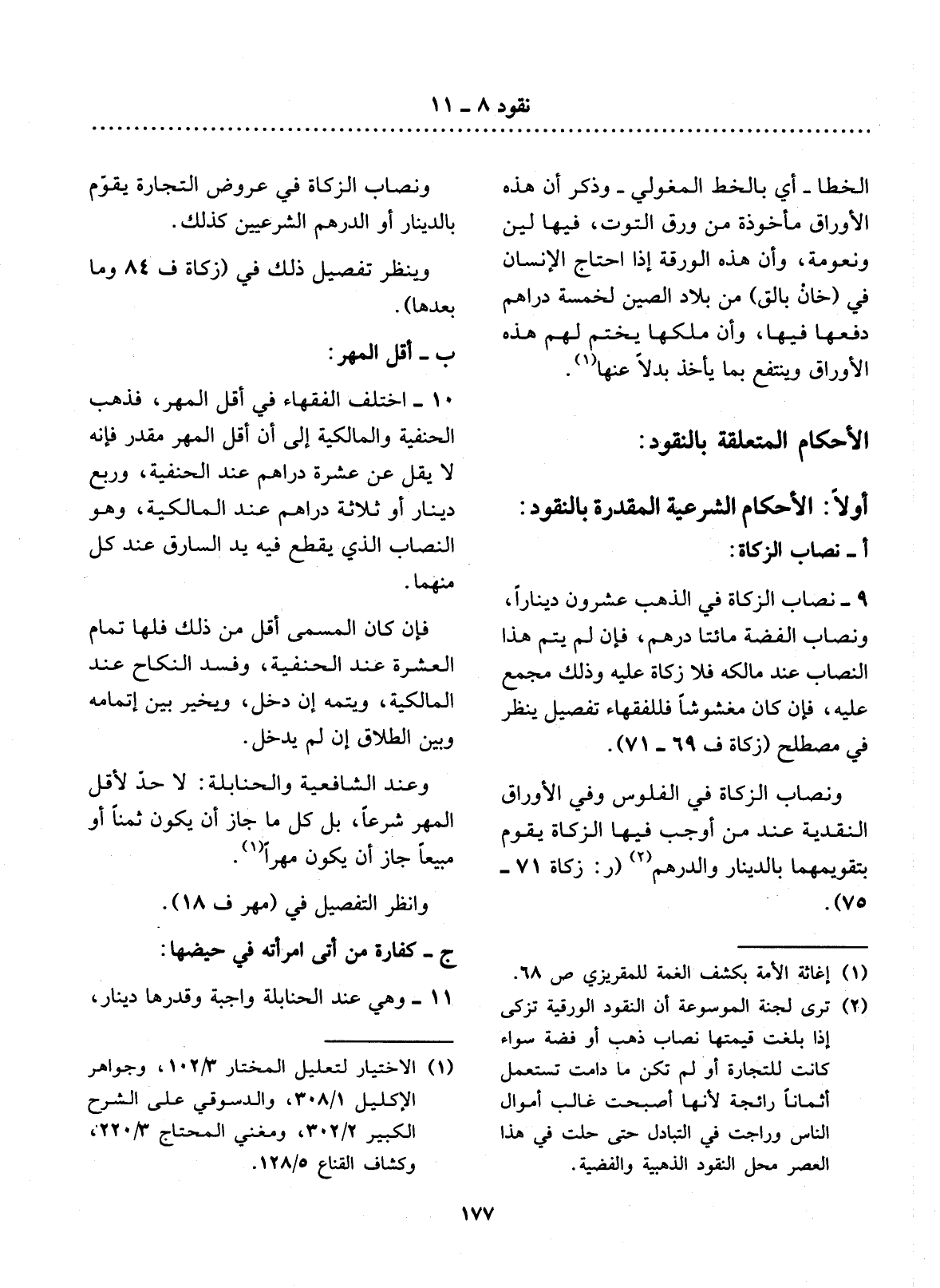 (2) ترى لجنة الموسوعة أن النقود الورقية تزكى إذا بلغت قيمتها نصاب ذهب أو فضة سواء كانت للتجارة أو لم تكن ما دامت تستعمل أثمانا رائجة لأنها أصبحت غالب أموال الناس وراجت في التبادل حتى حلت في هذا العصر محل النقود الذهبية والفضية