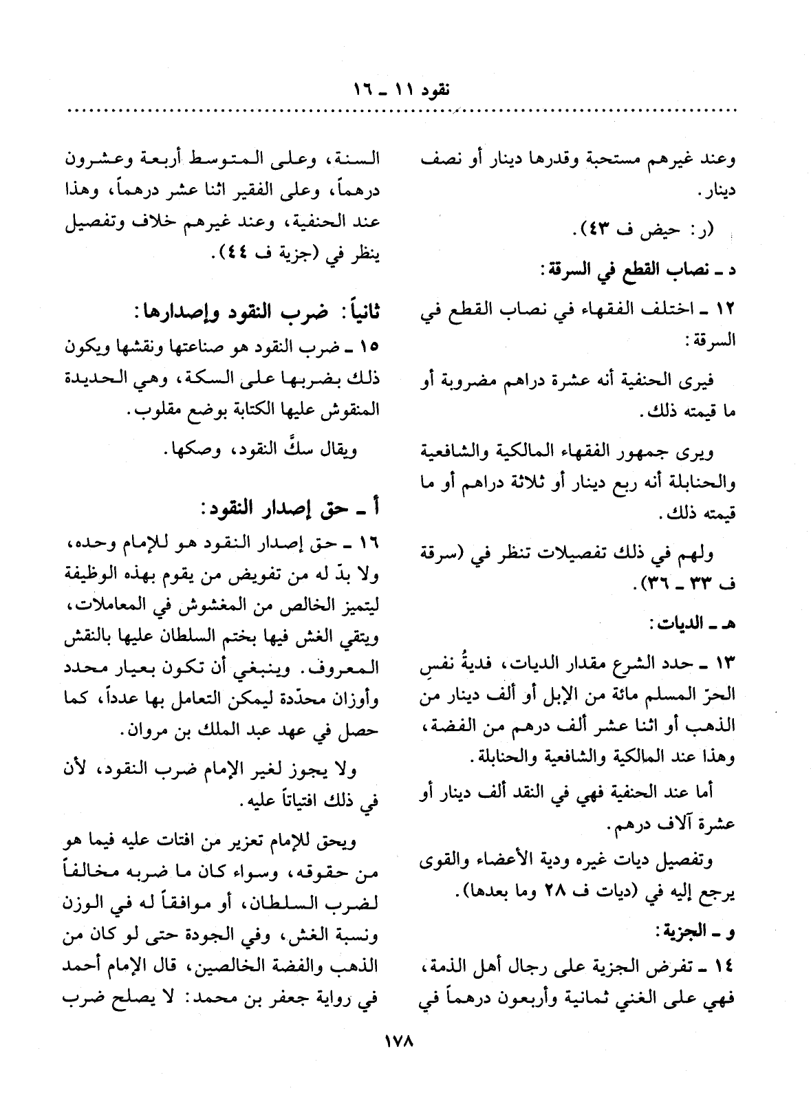 16 - حَقُّ إِصْدَارِ النُّقُودِ هُوَ لِلإِْمَامِ وَحْدَهُ، وَلاَ بُدَّ لَهُ مِنْ تَفْوِيضِ مَنْ يَقُومُ بِهَذِهِ الْوَظِيفَةِ لِيَتَمَيَّزَ الْخَالِصُ مِنَ الْمَغْشُوشِ فِي الْمُعَامَلاَتِ، وَيُتَّقَى الْغِشُّ فِيهَا بِخَتْمِ السُّلْطَانِ عَلَيْهَا بِالنَّقْشِ الْمَعْرُوفِ. وَيَنْبَغِي أَنْ تَكُونَ بِعِيَارٍ مُحَدَّدٍ وَأَوْزَانٍ مُحَدَّدَةٍ لِيُمْكِنَ التَّعَامُل بِهَا عَدَدًا، كَمَا حَصَل فِي عَهْدِ عَبْدِ الْمَلِكِ بْنِ مَرْوَانَ.
