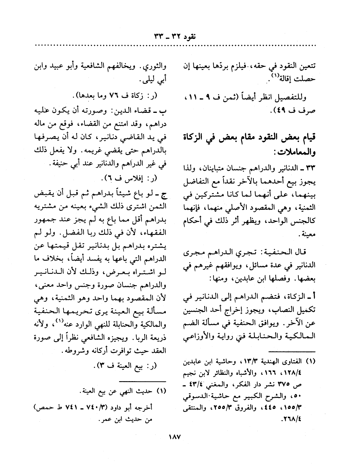 33 - الدَّنَانِيرُ وَالدَّرَاهِمُ جِنْسَانِ مُتَبَايِنَانِ، وَلِذَا يَجُوزُ بَيْعُ أَحَدِهِمَا بِالآْخَرِ نَقْدًا مَعَ التَّفَاضُل بَيْنَهُمَا، عَلَى أَنَّهُمَا لَمَّا كَانَا مُشْتَرِكَيْنِ فِي الثَّمَنِيَّةِ، وَهِيَ الْمَقْصُودُ الأَْصْلِيُّ مِنْهُمَا، فَإِنَّهُمَا كَالْجِنْسِ الْوَاحِدِ، وَيَظْهَرُ أَثَرُ ذَلِكَ فِي أَحْكَامٍ مُعَيَّنَةٍ.