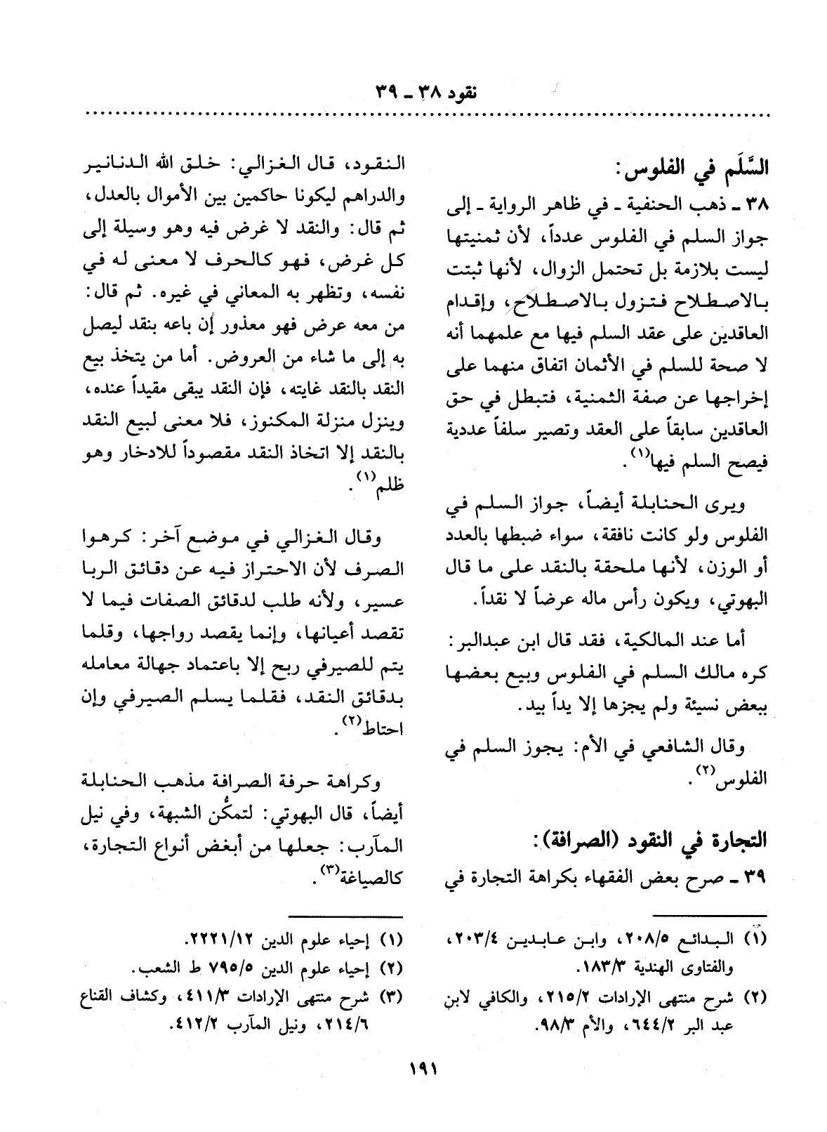 38 - ذَهَبَ الْحَنَفِيَّةُ - فِي ظَاهِرِ الرِّوَايَةِ - إِلَى جَوَازِ السَّلَمِ فِي الْفُلُوسِ عَدَدًا؛ لأَِنَّ ثَمَنِيَّتَهَا لَيْسَتْ بِلاَزِمَةٍ بَل تَحْتَمِل الزَّوَال، لأَِنَّهَا ثَبَتَتْ بِالاِصْطِلاَحِ فَتَزُول بِالاِصْطِلاَحِ، وَإِقْدَامُ الْعَاقِدَيْنِ عَلَى عَقْدِ السَّلَمِ فِيهَا مَعَ عِلْمِهِمَا أَنَّهُ لاَ صِحَّةَ لِلسَّلَمِ فِي الأَْثْمَانِ اتِّفَاقٌ مِنْهُمَا عَلَى إِخْرَاجِهَا عَنْ صِفَةِ الثَّمَنِيَّةِ، فَتَبْطُل فِي حَقِّ الْعَاقِدَيْنِ سَابِقًا عَلَى الْعَقْدِ وَتَصِيرُ سُلَفًا عَدَدِيَّةً فَيَصِحُّ السَّلَمُ فِيهَا (1) .
