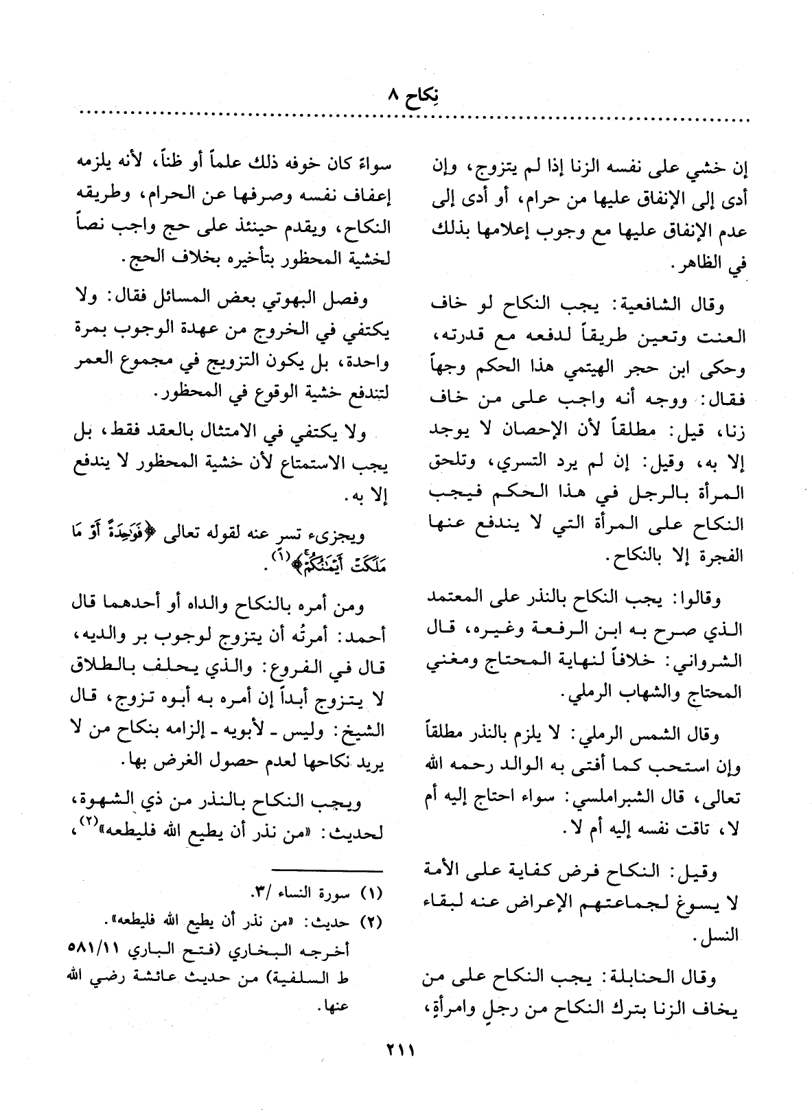 وَقَالُوا: يَجِبُ النِّكَاحُ بِالنَّذْرِ عَلَى الْمُعْتَمَدِ الَّذِي صَرَّحَ بِهِ ابْنُ الرِّفْعَةِ وَغَيْرُهُ، قَال الشَّرْوَانِيُّ: خِلاَفًا لِنِهَايَةِ الْمُحْتَاجِ وَمُغْنِي الْمُحْتَاجِ وَالشِّهَابِ الرَّمْلِيِّ.