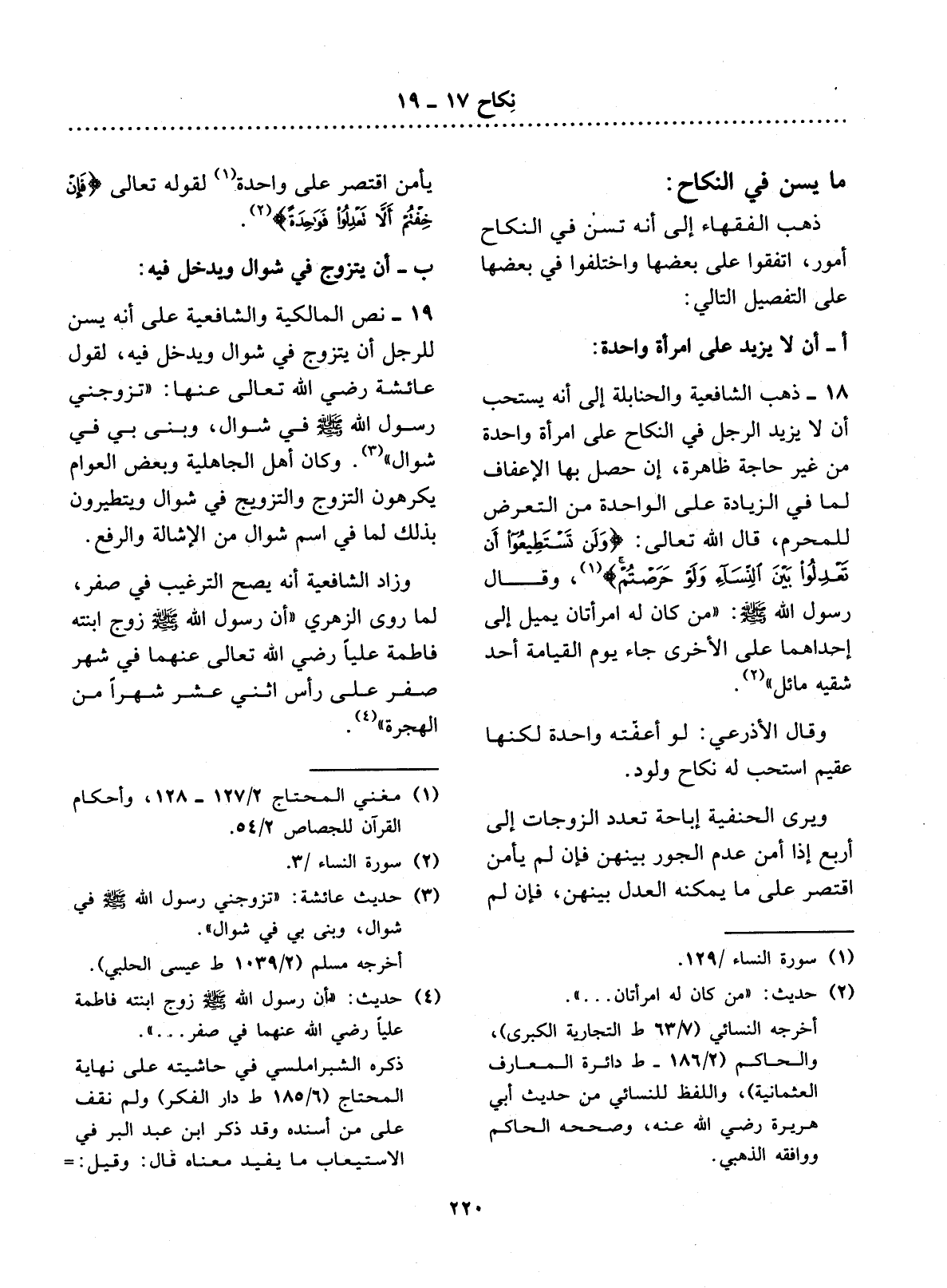 18 - ذَهَبَ الشَّافِعِيَّةُ وَالْحَنَابِلَةُ إِلَى أَنَّهُ يُسْتَحَبُّ أَنْ لاَ يَزِيدَ الرَّجُل فِي النِّكَاحِ عَلَى امْرَأَةٍ وَاحِدَةٍ مِنْ غَيْرِ حَاجَةٍ ظَاهِرَةٍ، إِنْ حَصَل بِهَا الإِْعْفَافُ لِمَا فِي الزِّيَادَةِ عَلَى الْوَاحِدَةِ مِنَ التَّعَرُّضِ لِلْمُحَرَّمِ، قَال اللَّهُ تَعَالَى: {وَلَنْ تَسْتَطِيعُوا أَنْ تَعْدِلُوا بَيْنَ النِّسَاءِ وَلَوْ حَرَصْتُمْ (1) } ، وَقَال رَسُول اللَّهِ صَلَّى اللَّهُ عَلَيْهِ وَسَلَّمَ: " مَنْ كَانَ لَهُ امْرَأَتَانِ يَمِيل إِلَى إِحْدَاهُمَا عَلَى الأُْخْرَى جَاءَ يَوْمَ الْقِيَامَةِ أَحَدُ شِقَّيْهِ مَائِلٌ " (2) .