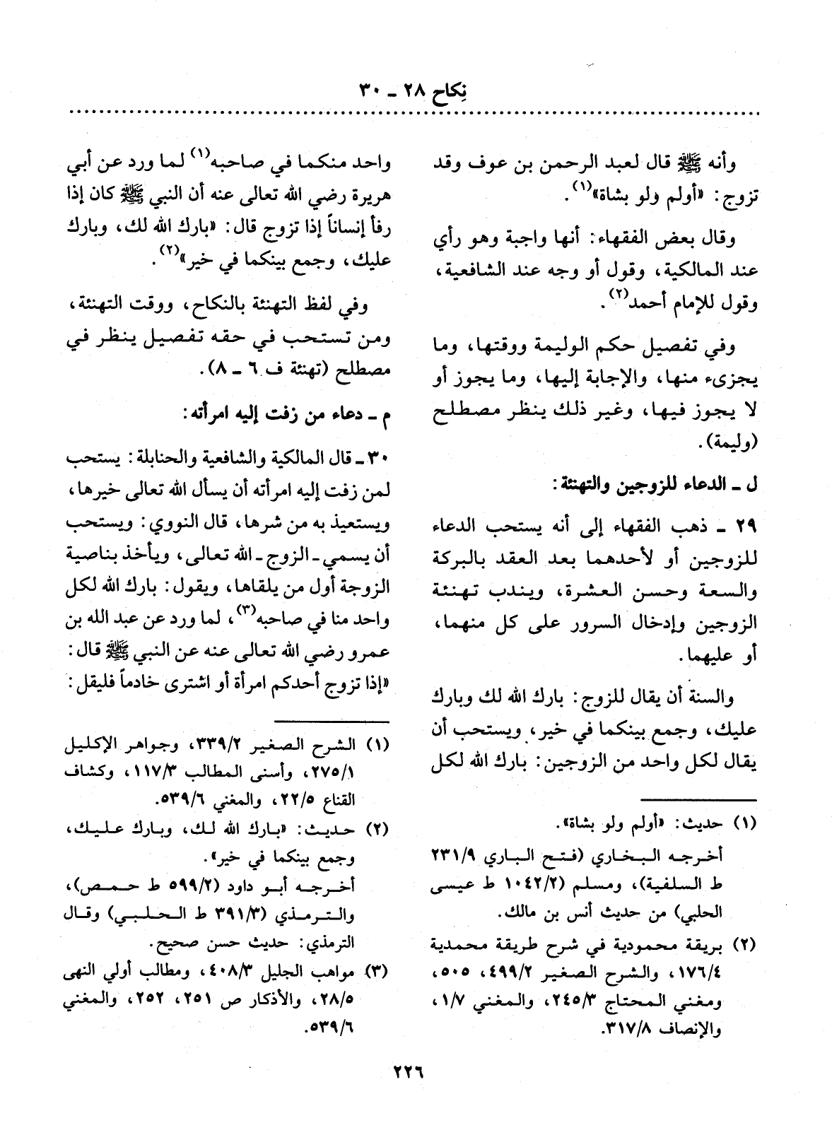 29 - ذَهَبَ الْفُقَهَاءُ إِلَى أَنَّهُ يُسْتَحَبُّ الدُّعَاءُ لِلزَّوْجَيْنِ أَوْ لأَِحَدِهِمَا بَعْدَ الْعَقْدِ بِالْبَرَكَةِ وَالسَّعَةِ وَحُسْنِ الْعِشْرَةِ، وَيُنْدَبُ تَهْنِئَةُ الزَّوْجَيْنِ وَإِدْخَال السُّرُورِ عَلَى كُلٍّ مِنْهُمَا، أَوْ عَلَيْهِمَا.